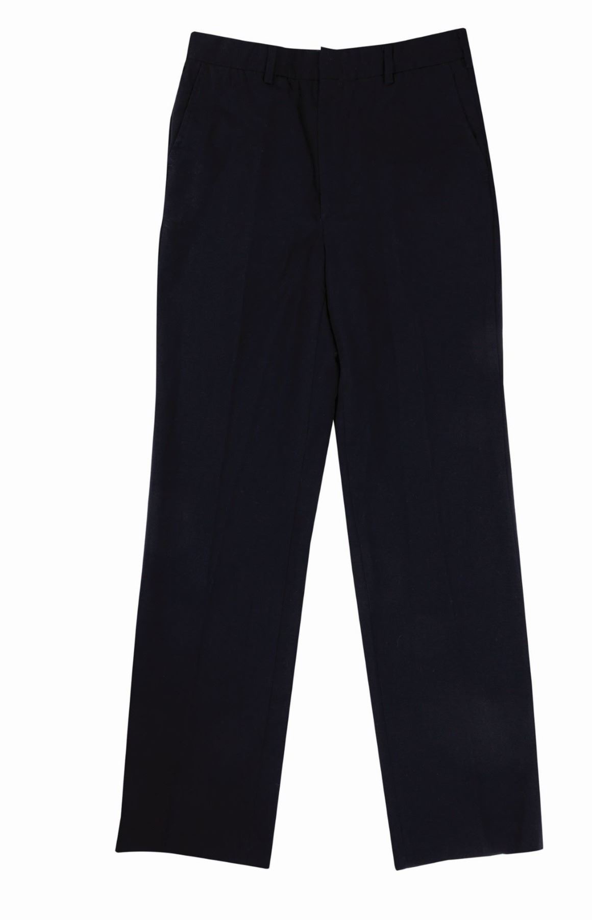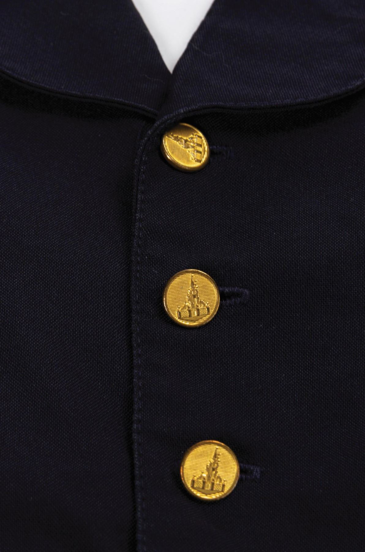 (Disneyland, c.1990s) A park-used cast member costume for a Disneyland Railroad train conductor. A fixture since the park's opening, the Disneyland Railroad was especially close to Walt Disney's heart, being a miniature railroad enthusiast himself. The 3-piece ensemble includes a midnight blue vest with rounded lapels, a white button-down dress shirt, and a pair of midnight blue trousers with zipper and tab-and-eye front closure. The vest retains an internal Disney Worldwide Services barcode label and is size 44R, the shirt is size M (15), and the pants are size 32. In good condition overall, the costume exhibits only minor wear.