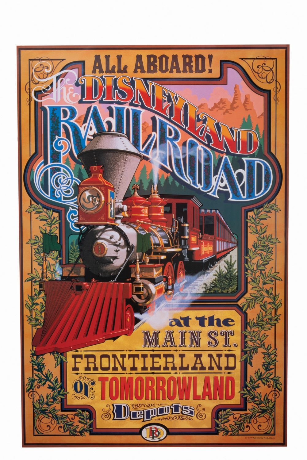 (Disneyland, 1990s) A full-size Disneyland Railroad attraction poster reproduction from the Disney Gallery. For a very short time, the Disney Gallery offered a limited amount of full-size reproduction attraction posters for many of the well-known Disneyland attractions. This faithful reproduction measures 36"x54"and is in fine condition with light wear to edges.