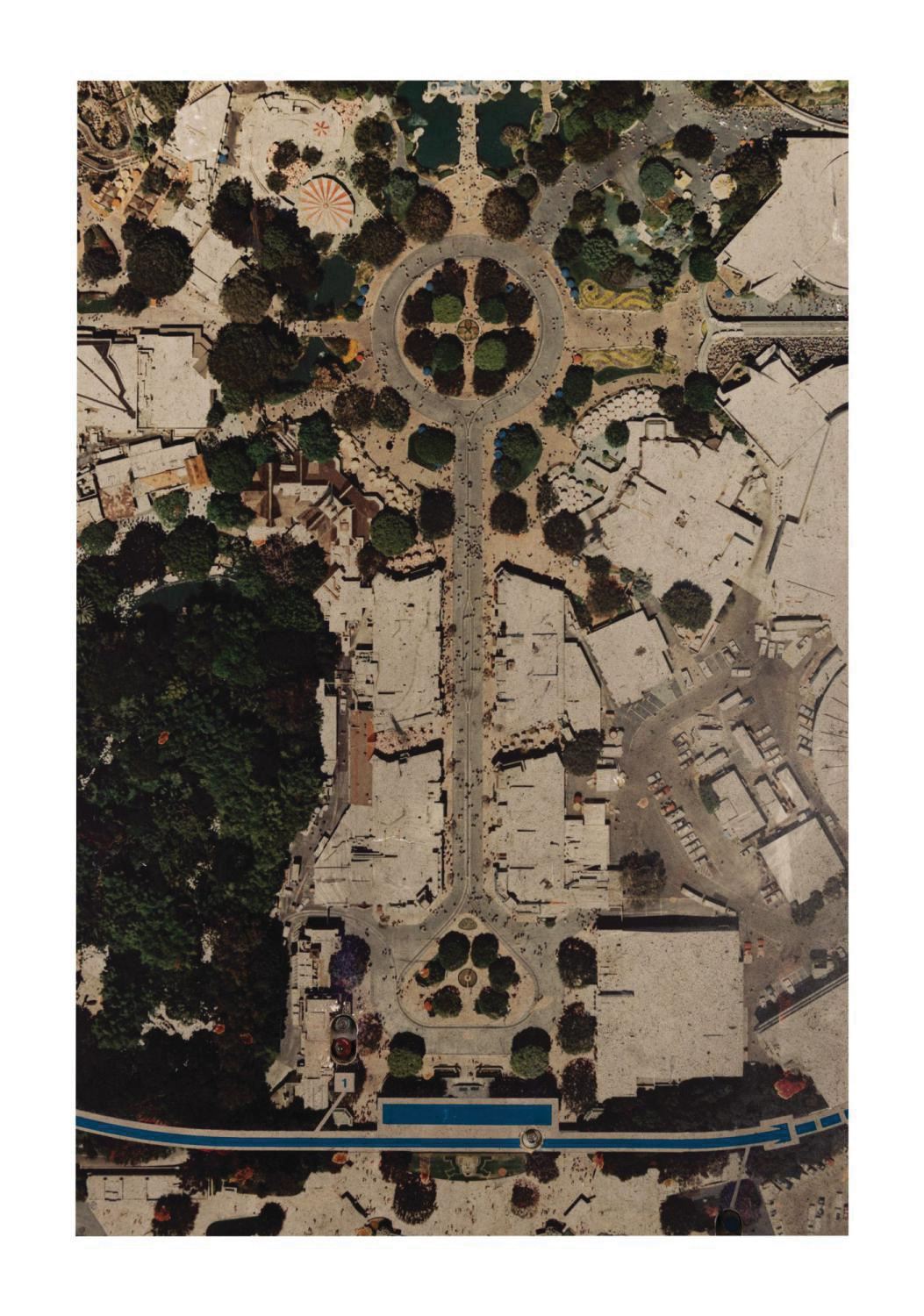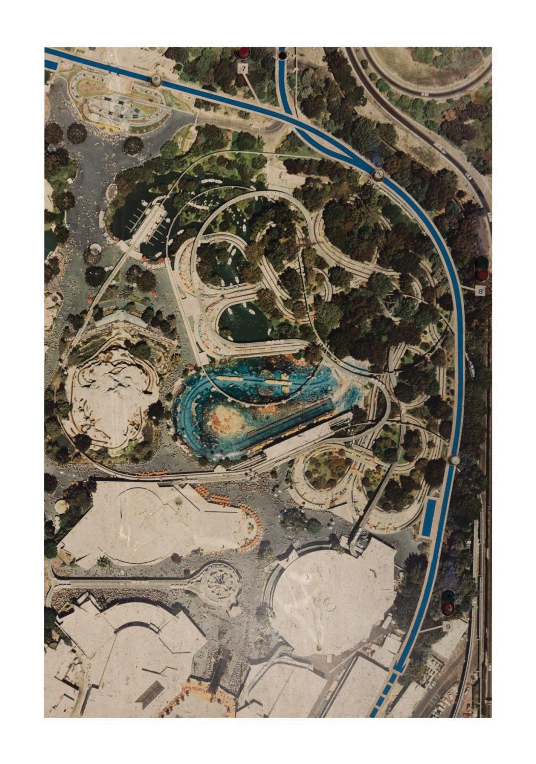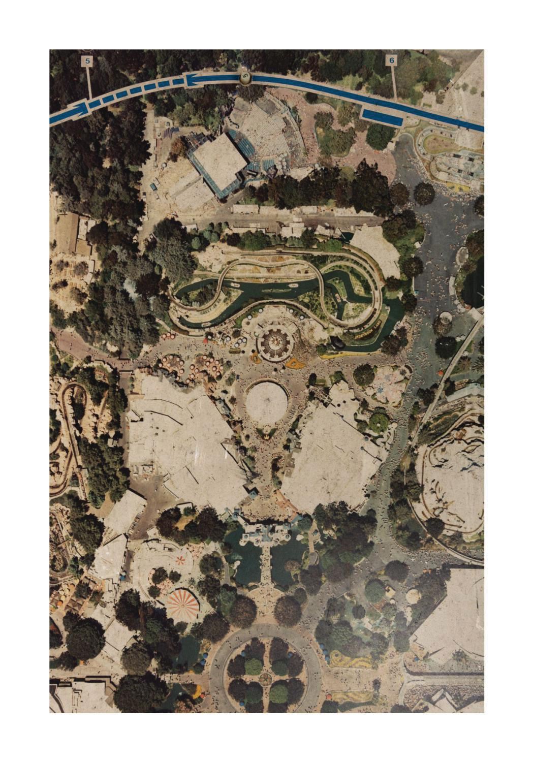 (Disneyland, c.1985-88) A Disneyland Railroad Electronic Tracking Board once utilized to report the location of all five trains and their rolling stock on the Disneyland Railroad. The tracking board contains two layered large aerial photos, as it became practical to mount a current aerial blow-up photo on the face of the panel over the previously used circa 1985 photo. This fascinating early component of Disneyland's Railroad history was likely removed from either the Main Street Station office or the Roundhouse office, prior to the more modern use of computerized systems. Measuring 39.25"x34", with various electronic components on the reverse, the tracking board displays in very good condition, with a few missing lighting and electrical components and areas of surface wear.