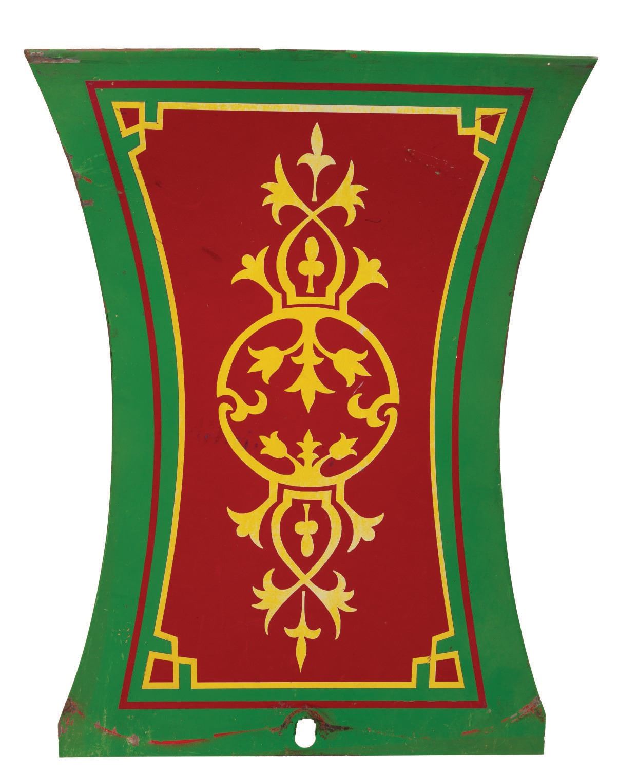 (Disneyland, c.1990s-2000s) A beautiful metal seat panel used on a Disneyland Railroad excursion car. This panel once decorated the side of a passenger bench on an excursion car with an ornate design. Measuring approximately 19"x15", the panel is in good condition with expected surface wear from use. There are small surface scuffs and spots of paint wear, but the prop still displays beautifully.