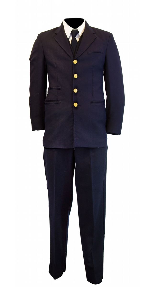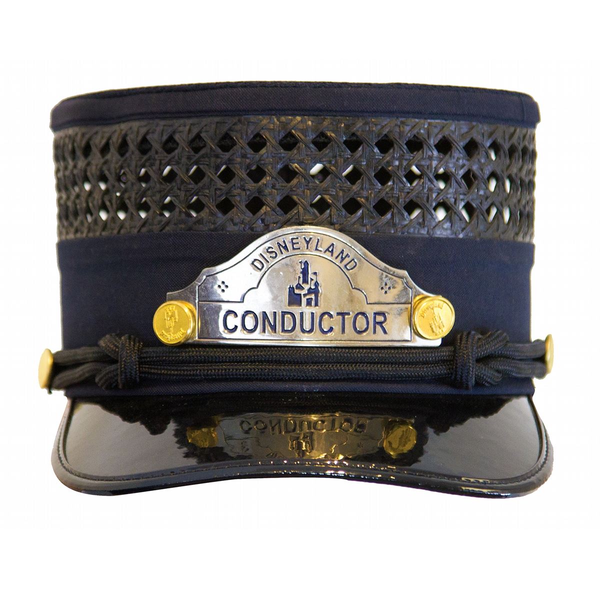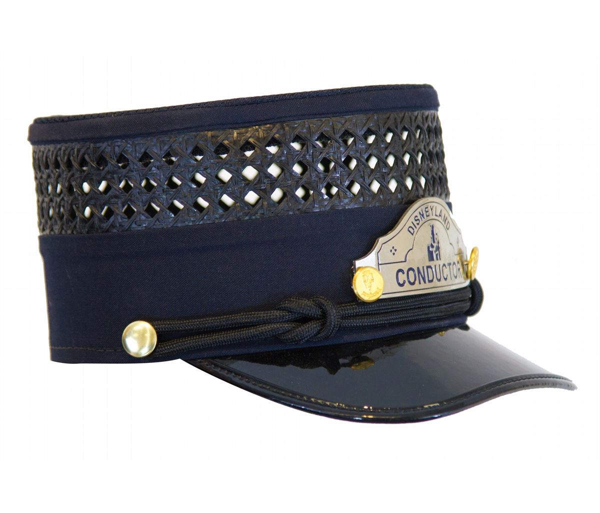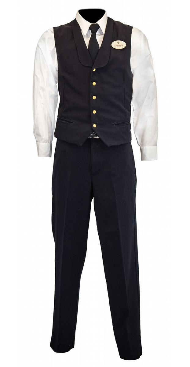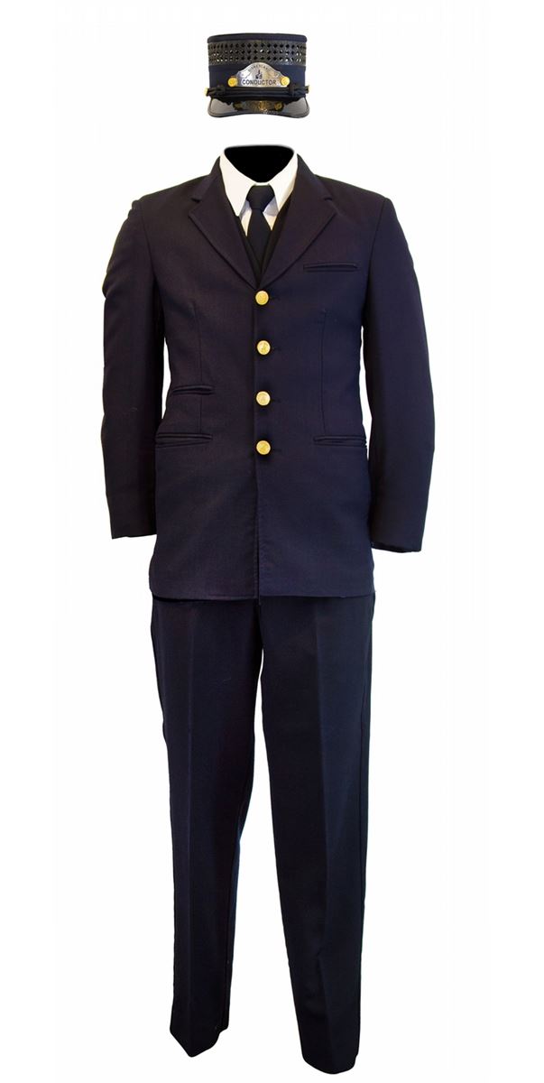(Disneyland, 1990s) A complete cast member conductor costume for the Disneyland Railroad, including pants, vest, coat, shirt, belt, tie, conductor’s cap and cast member name tag. In very good condition with some wear from use.