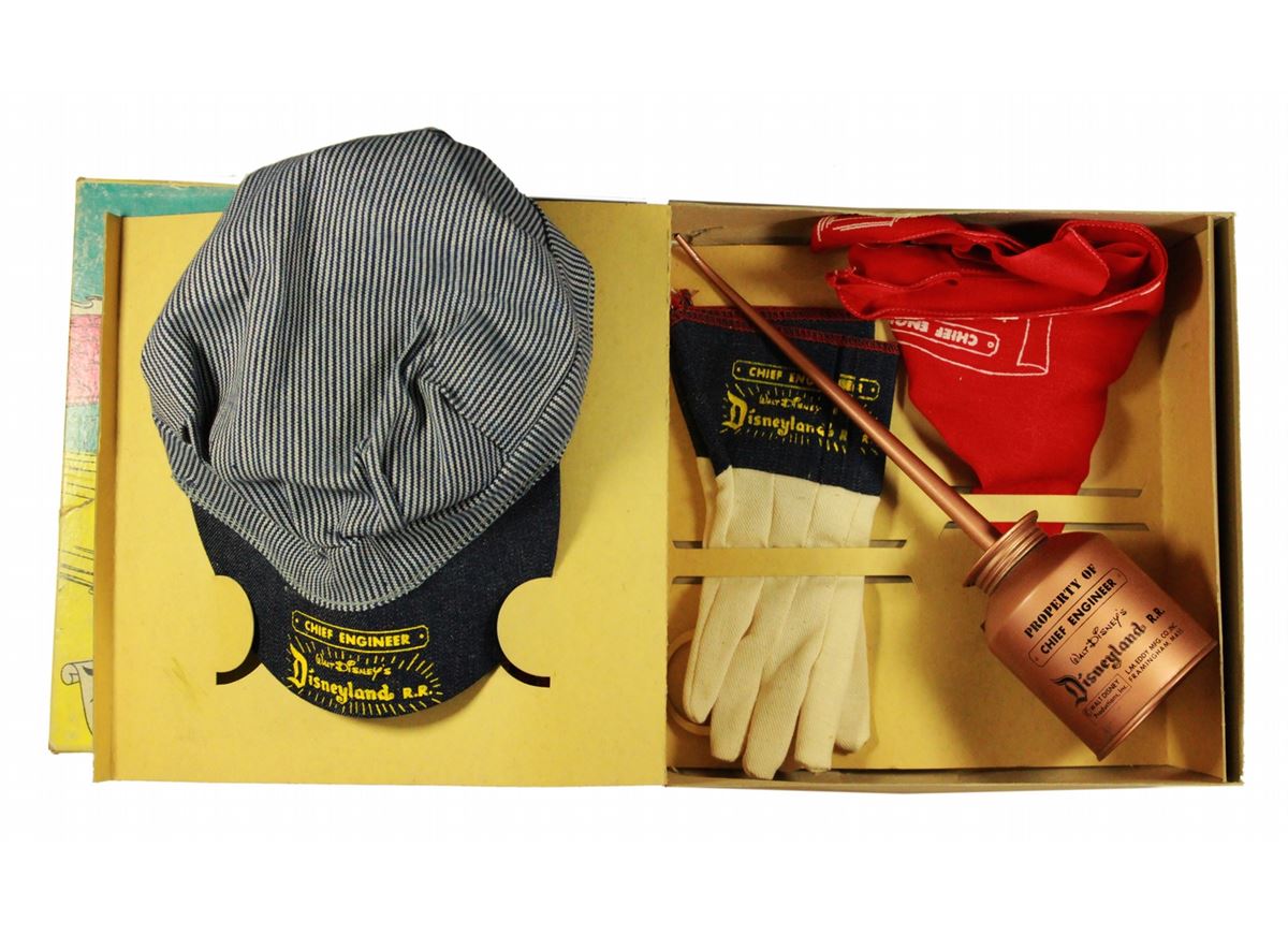 (Disneyland, 1958) A mint-in-box Disneyland Railroad child’s chief engineer costume sold in main street stores in the late 1950s. The costume includes an engineer’s hat, gloves, bandanna, and oil can. Box measures 10 x 10 x 4 in. In good condition with wear to box.