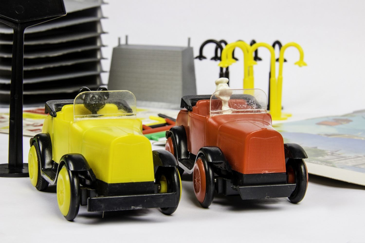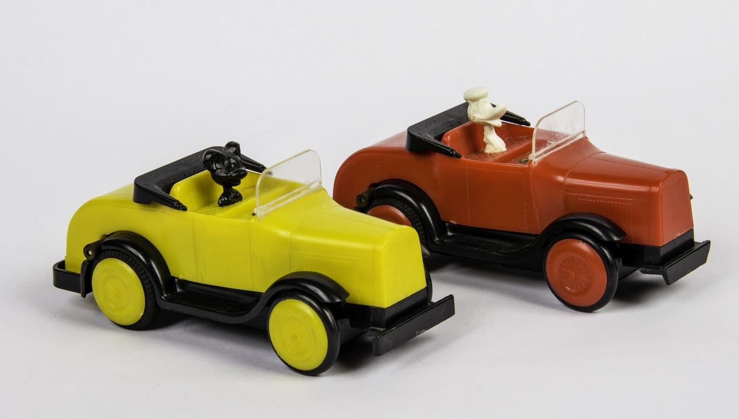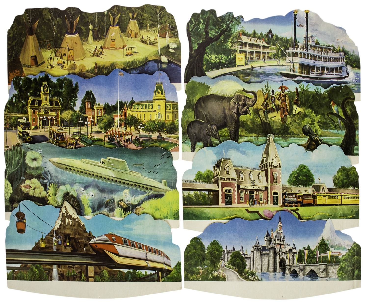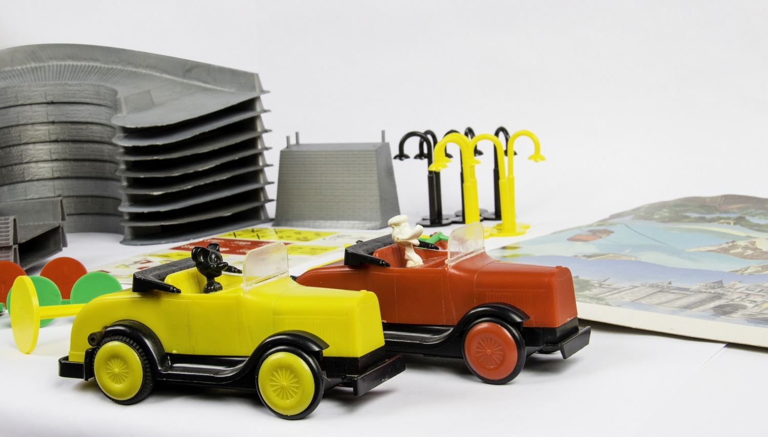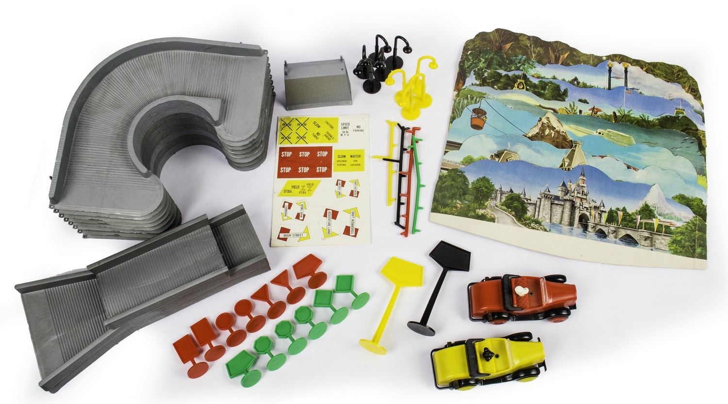 (Disneyland, c.1965) A rare vintage Disneyland playset from Sears Wish Catalog which offers a complete motor tour of Disneyland in two battery powered autos with Mickey and Donald as your guide. This set includes (8) pieces of track, Mickey and Donald vehicles, (8) die-cut Disneyland scenery backgrounds featuring artwork from 1959, as well as lampposts and signs, and a decal sheet for the signs. This set is in good condition with some wear from light use and comes in its original mailing box from Sears. The vehicles have not been tested for battery-functionality but appear to be in very good condition.