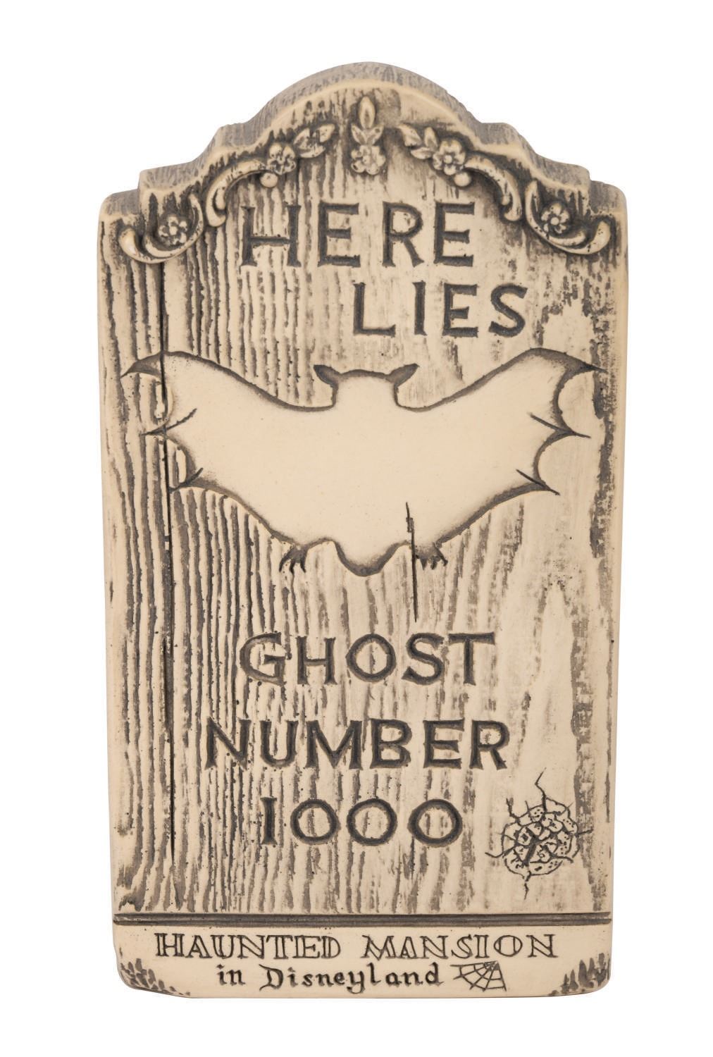 (Disneyland, 1970s) A Haunted Mansion Tombstone souvenir by Randotti. The wall-mountable tombstone plaque reads "here lies ghost number 1000" Measuring 4"x7.75", the resin tombstone displays in fine condition.