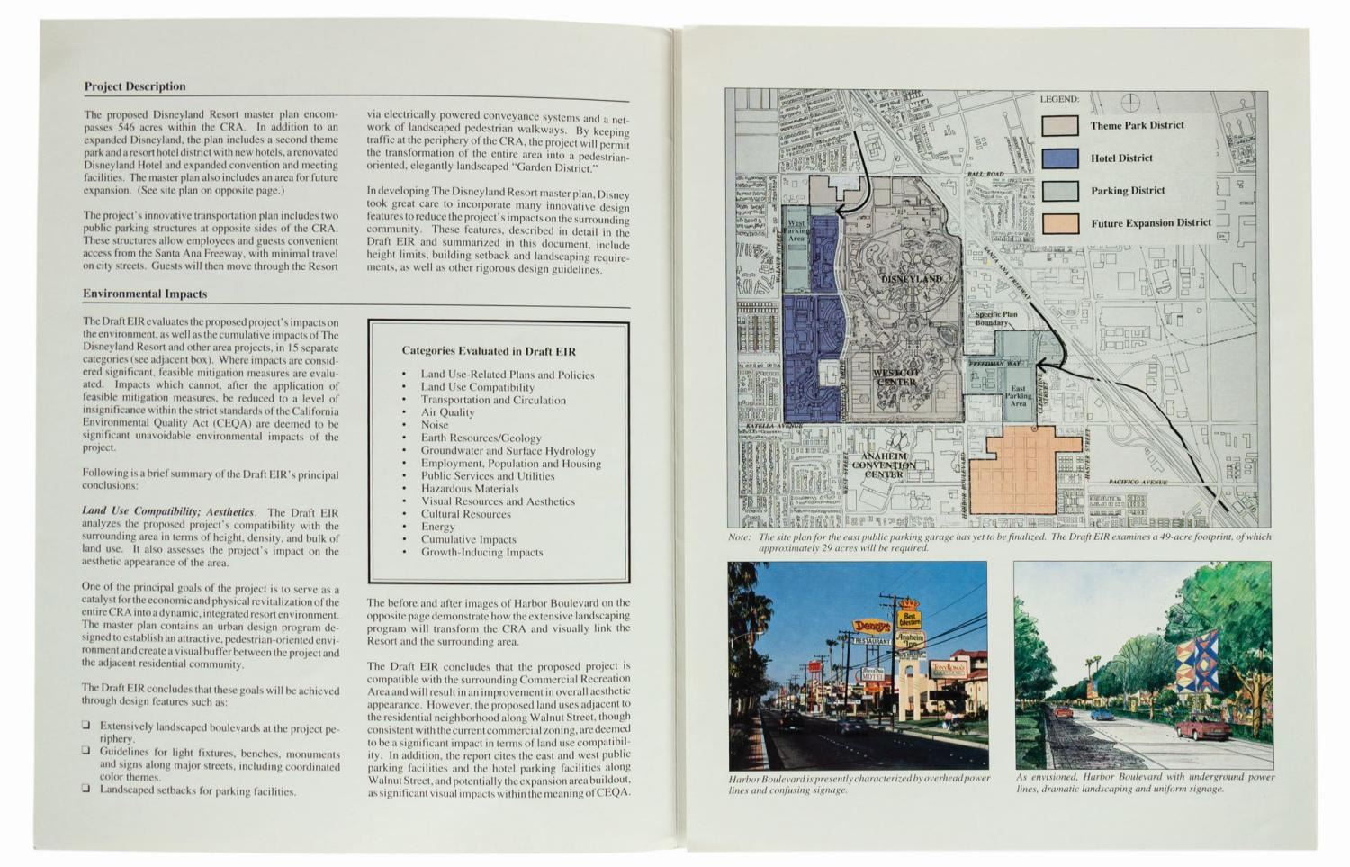 (Disneyland, 1991) A rare Draft Environmental Impact Report Summary produced by the City of Anaheim for a proposed expansion of the Disneyland Resort. The tri-folded 6-page brochure contains information on the various environmental ramifications of a larger Disneyland in categories of land use compatibility and aesthetics, transportation and circulation, air quality, employment, population, housing, public services and utilities, noise, and construction period impacts. The conclusions of the report were positive to the expansion, with new jobs, enhanced tax revenues, greater economic activity, and an increase in tourism being major factors in its favor. Measuring 11"x8.5", the brochure is in fine condition with only minor handling wear.