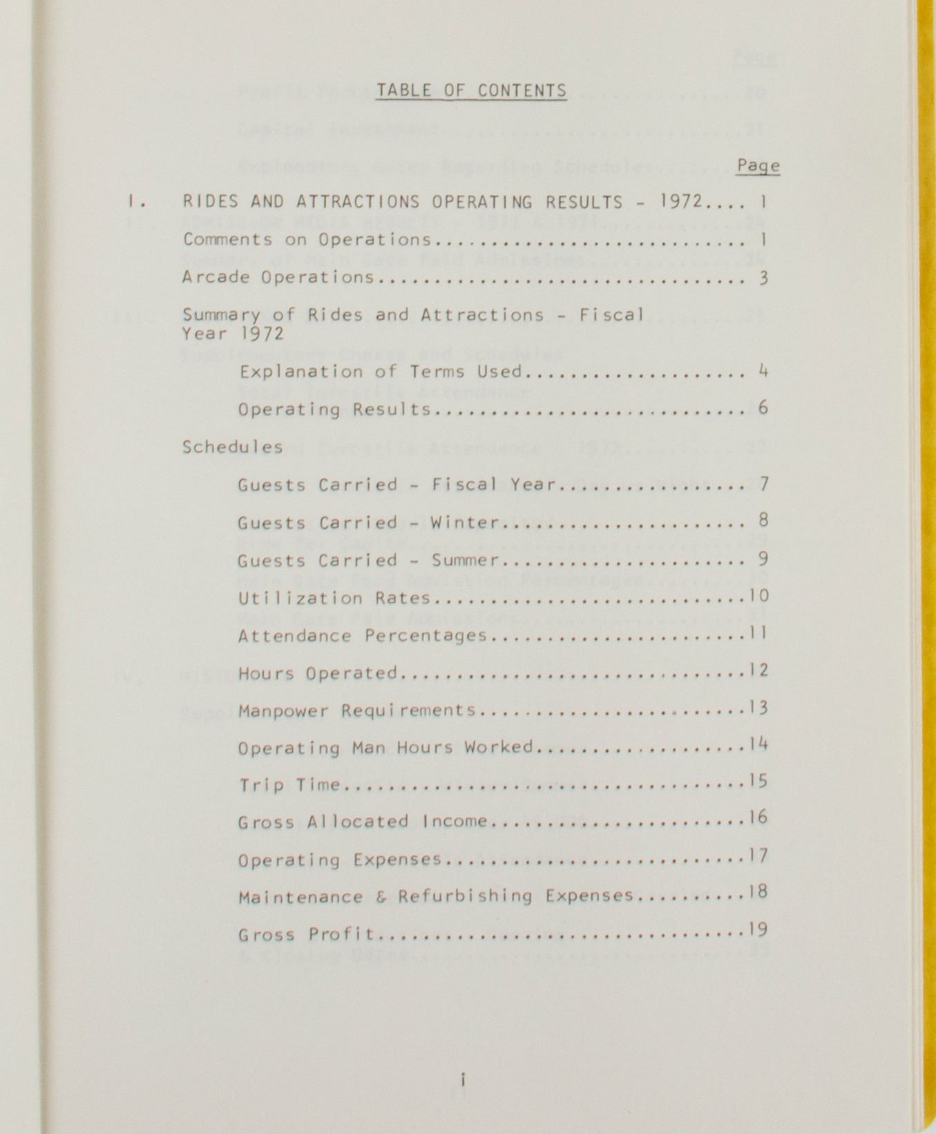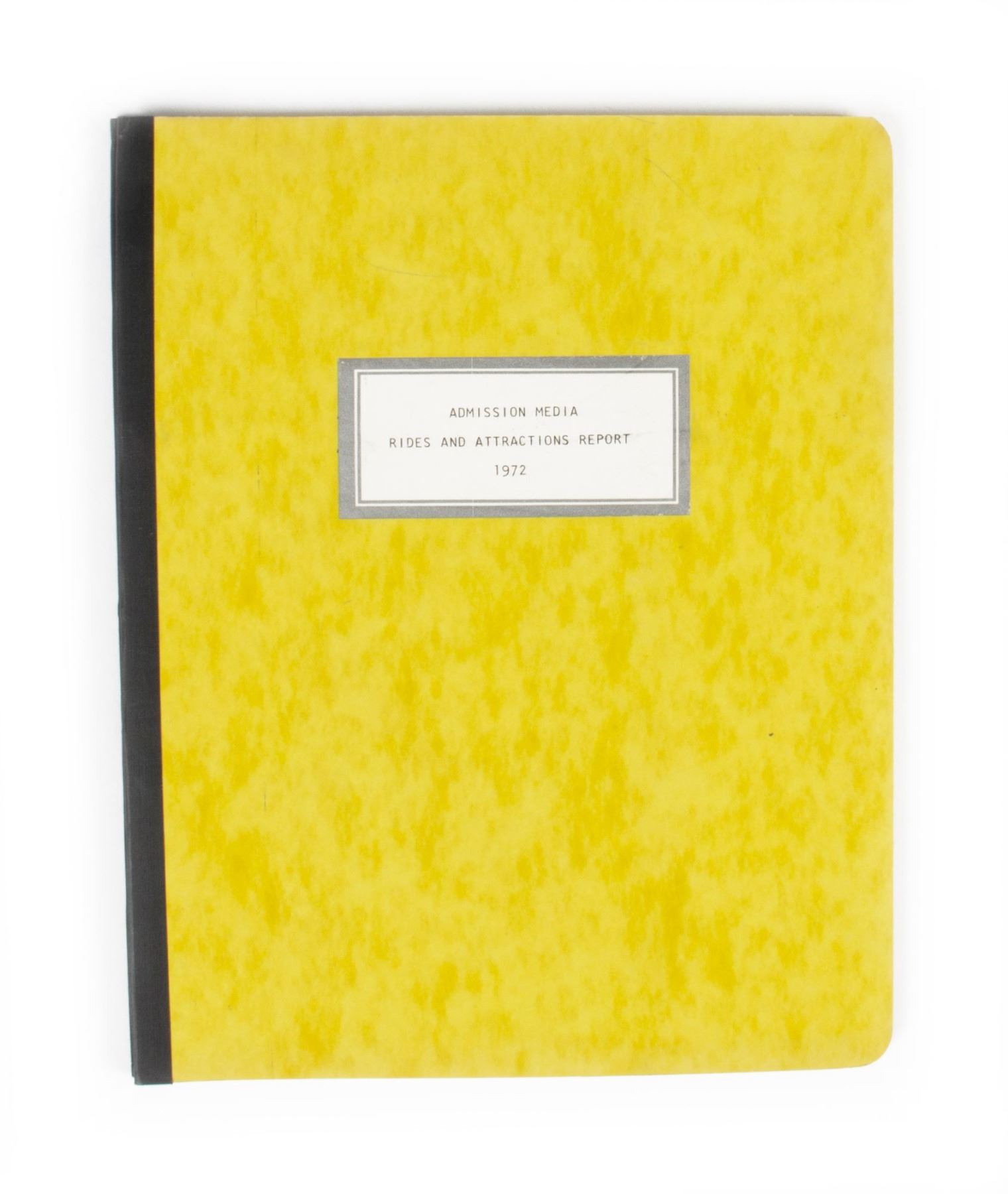 (Disneyland, 1972-73) A very rare "Admission Media - Rides and Attractions Report" that was created by Disneyland's Research Department. The report provides information on the 1972 year but was prepared in 1973. The report includes information on guest numbers, hours of operation, gross income, graphs and charts, and much more. Copies of this document were sent to such influential Disney employees as Card Walker, Dick Nunis, John Hench, and Jack Lindquist, among others. Measuring 11.5"x9.25", the report is in very good condition with little wear.