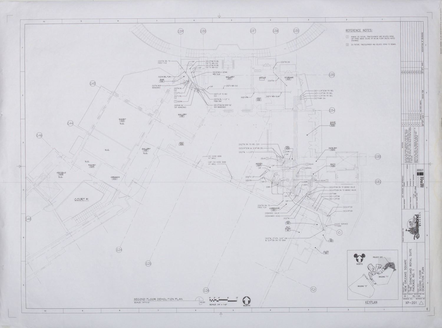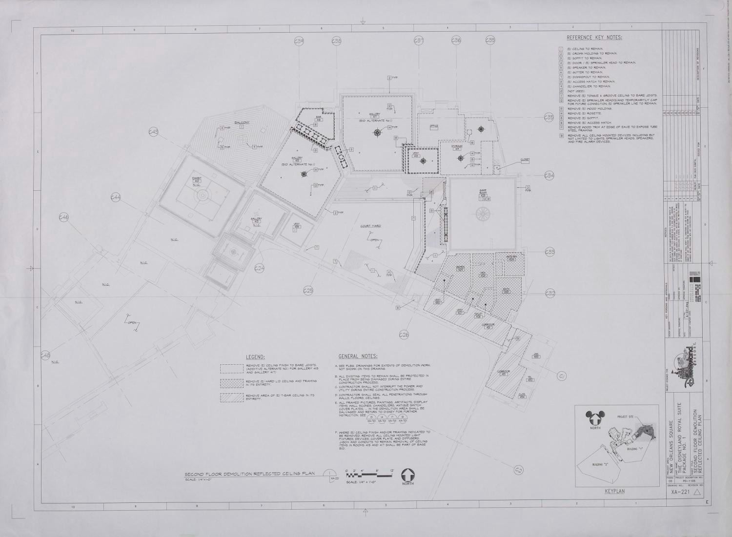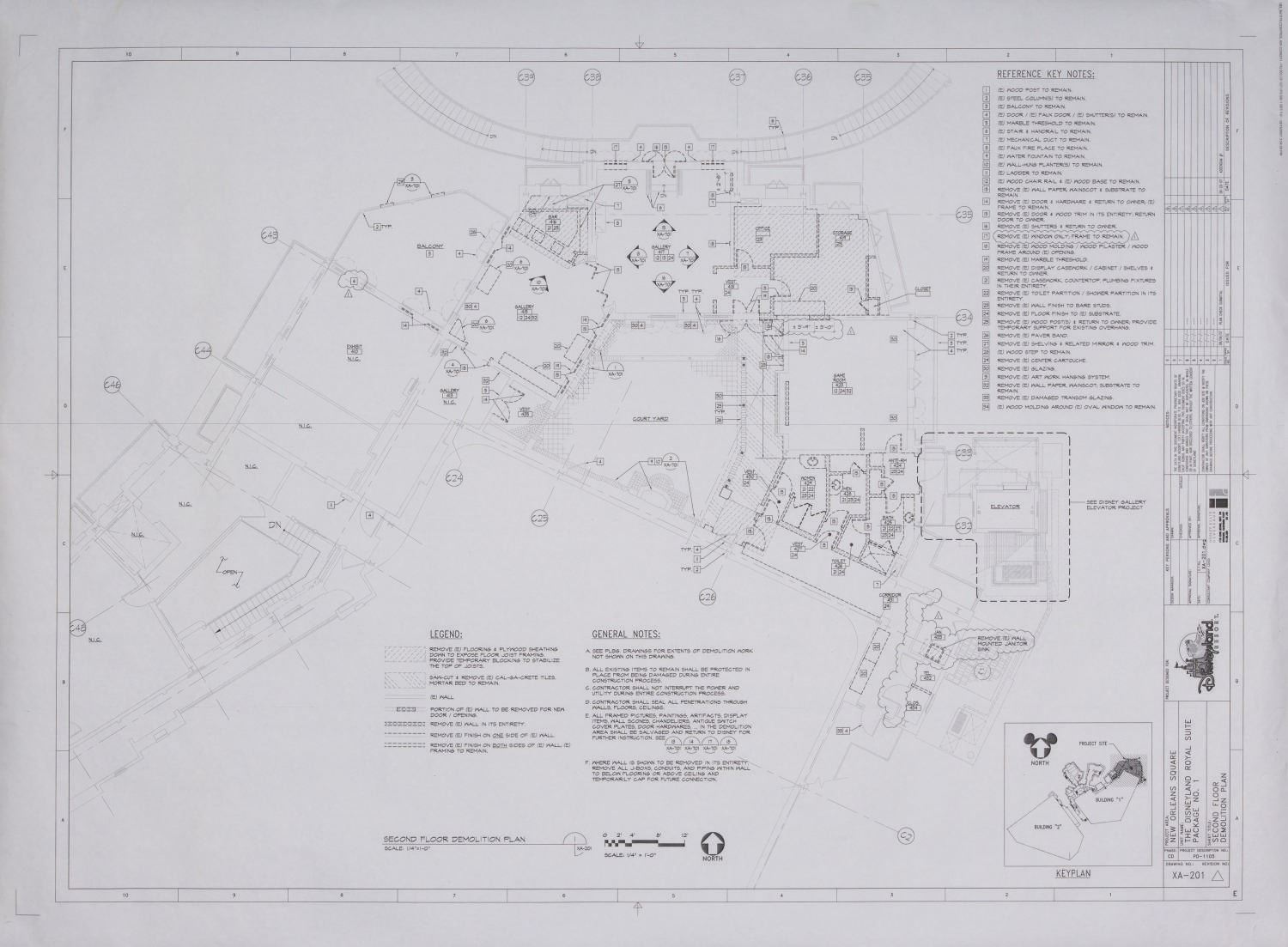 (Disneyland, 2007) A collection of (7) floor plans for the Royal Suite Project at Disneyland Resort. The blueprints detail the demolition and new construction plans, and schedule for the "conversion/renovation of second story gallery into a single unit hotel suite above Pirates of the Caribbean attraction entry." The "single unit hotel" would be known by many names including the "Royal Suite" and most recently, "21 Royal." Among the collection are xeroxed images of the suite, demolition plans for the 2nd floor rooms and ceiling of the New Orleans Square apartment. Measuring 49"x36", the prints are stapled together and display in very good condition, despite slight curling and light wear to edges and corners.