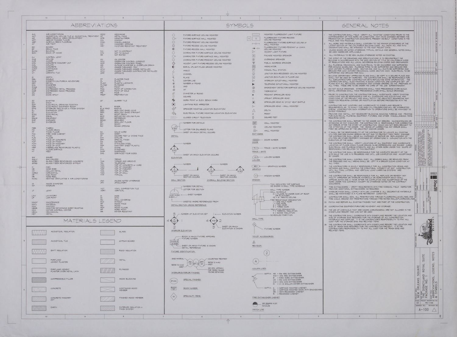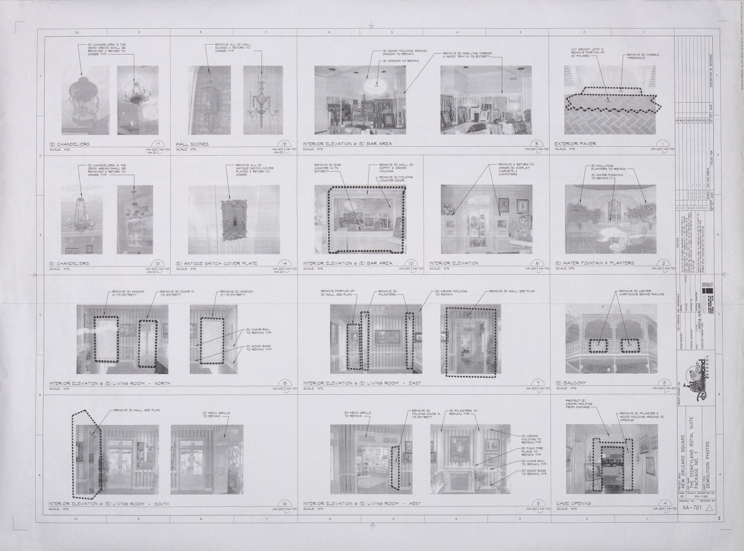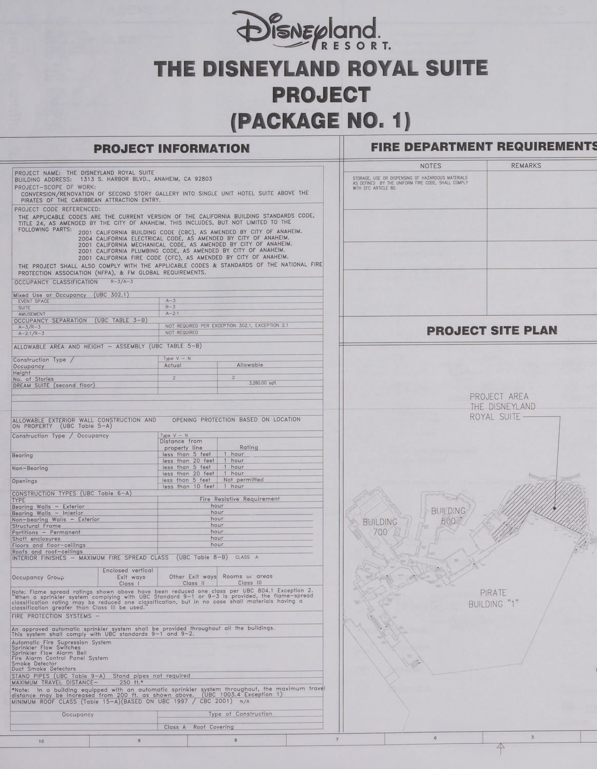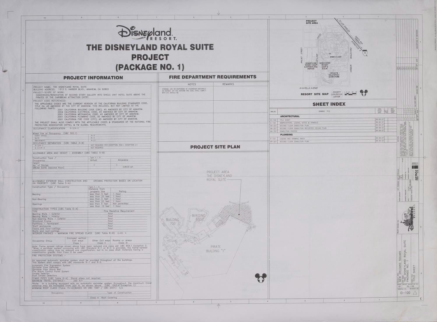 (Disneyland, 2007) A collection of (7) floor plans for the Royal Suite Project at Disneyland Resort. The blueprints detail the demolition and new construction plans, and schedule for the "conversion/renovation of second story gallery into a single unit hotel suite above Pirates of the Caribbean attraction entry." The "single unit hotel" would be known by many names including the "Royal Suite" and most recently, "21 Royal." Among the collection are xeroxed images of the suite, demolition plans for the 2nd floor rooms and ceiling of the New Orleans Square apartment. Measuring 49"x36", the prints are stapled together and display in very good condition, despite slight curling and light wear to edges and corners.