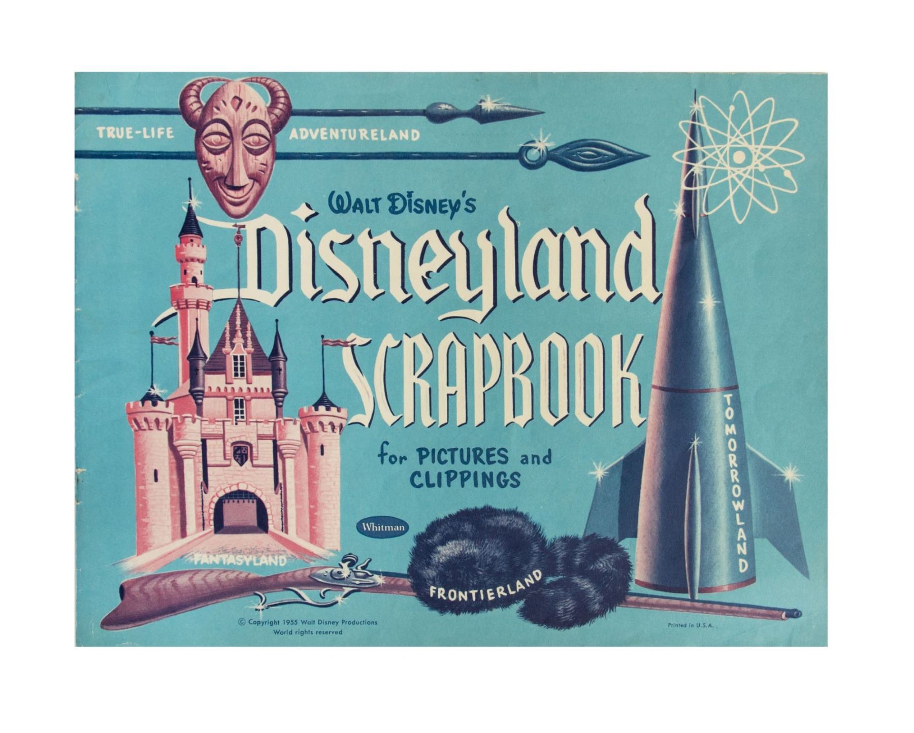 (Disneyland, 1955) An early Disneyland scrapbook featuring imagery of the different lands of the park on the cover. This book measures 8.5"x11" and is in very good condition with minor wear. The scrapbook pages are blank but there have likely been a few pages removed.