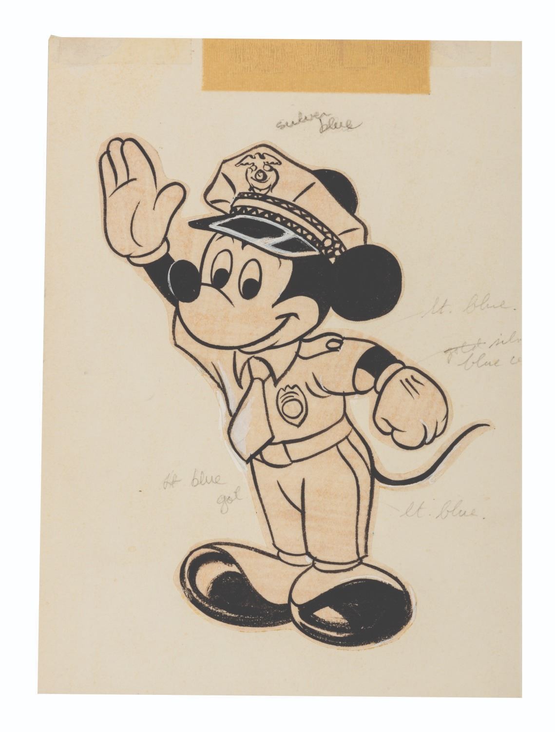 (Disneyland, 1980s) A concept illustration of the Mickey Mouse security logo created for Disneyland Security Hosts and Hostesses. The illustration includes annotations concerning the color palette for the logo. With a character image size of 4.5” x 5.75” on 5.5” x 7.5” artist’s board, the piece displays in very good condition with light scratches, tape, and wear from production use.