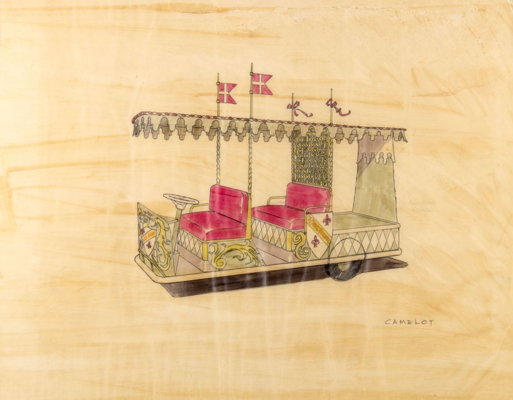 (Disneyland, c.1955) An original hand-colored concept drawing by Imagineer Bruce Bushman. This concept was created for a Disneyland service vehicle themed after the "King Arthur Carrousel" attraction. Titled "Camelot", this drawing is accomplished in India ink and watercolor on thin artist's paper. This drawing measures 18.5"x23.5" and is in good condition with adhesive discoloration throughout the sheet. There is a thin strip of tape along the top-edge on the reverse.