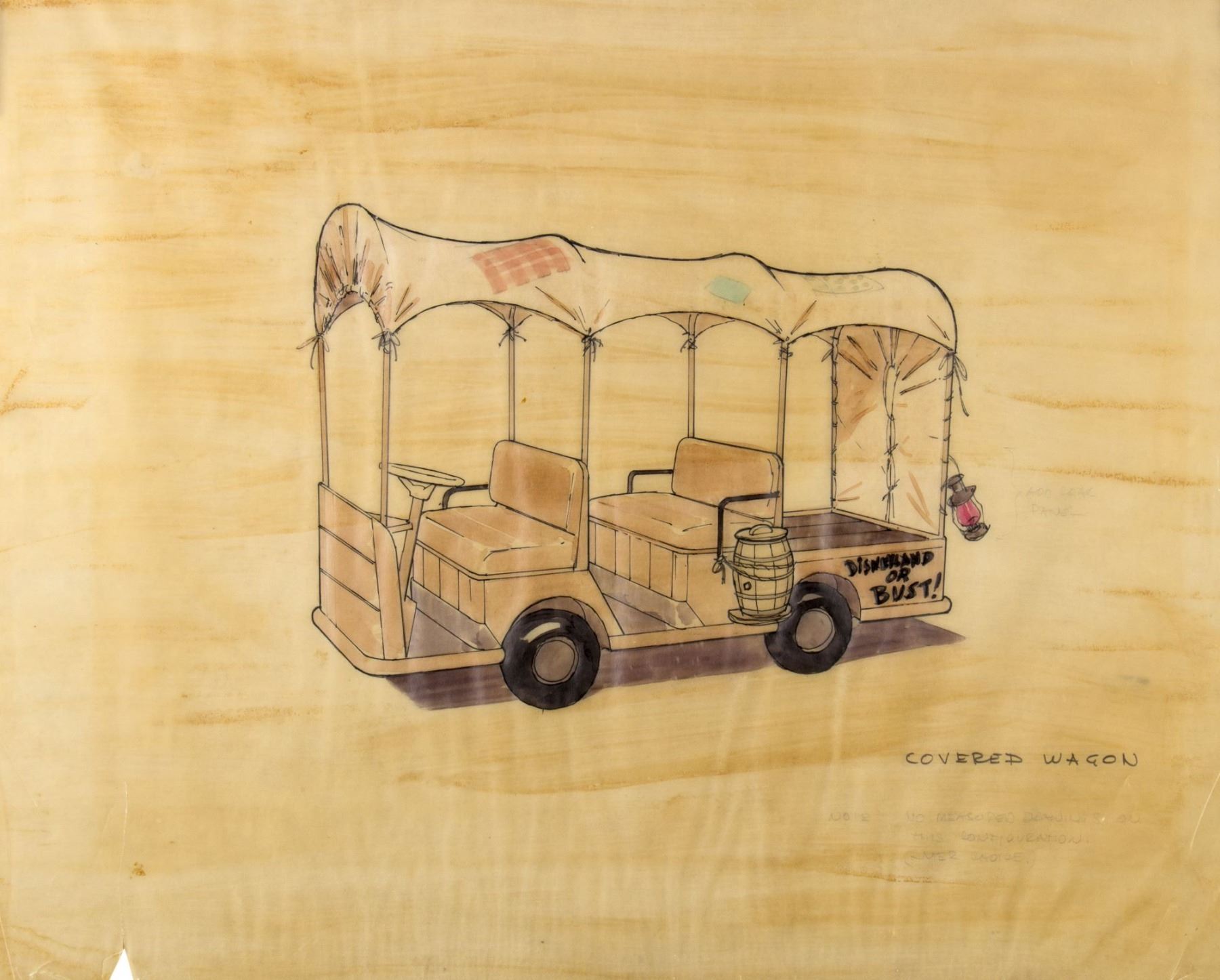 (Disneyland, c.1955) An original hand-colored concept drawing by Imagineer Bruce Bushman. This concept was created for a Disneyland service vehicle based on Frontierland. This original drawing is accomplished in India ink and watercolor on thin artist's paper and reads "Disneyland or Bust!". The paper measures 18.5"x23.5" and is in good condition with adhesive discoloration throughout the sheet, and a thin strip of tape along the top-edge of the reverse. There is a thin 3.5" tear in lower-left corner.