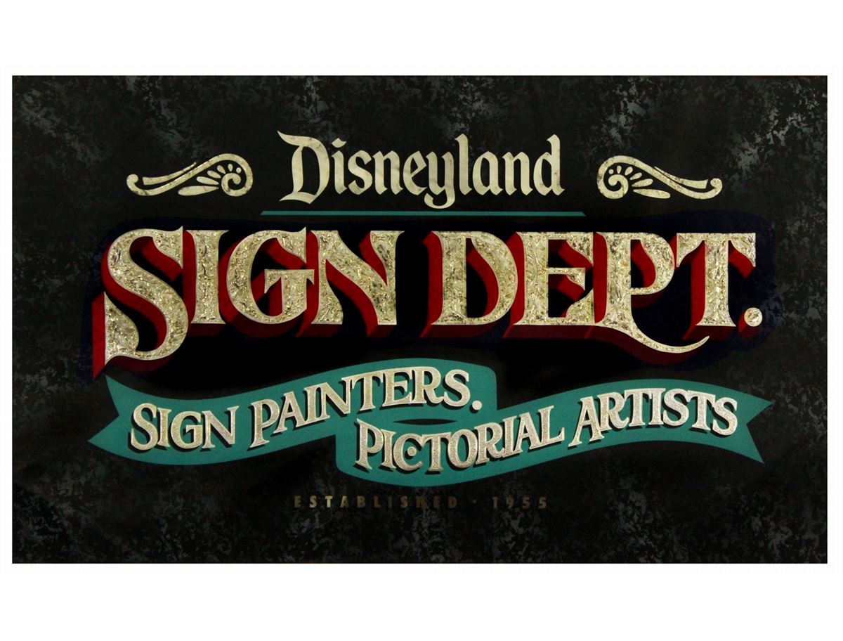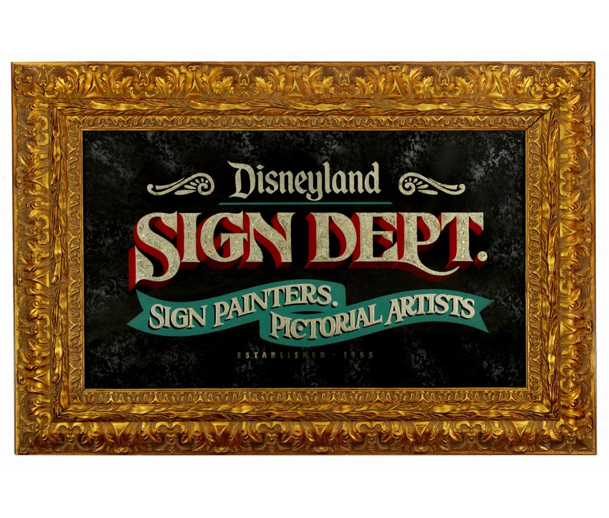 (Disneyland, 1970s) What a beauty! An absolute testament to the pride, artistry and craftsmanship present in many of the original maintenance and creative divisions of Disneyland. This stunning piece of art was created by the Sign & Pictorial Department’s Supervisor and hung in the main office of said department within the park. Done in the centuries-old technique of reverse-painted, glue chip glass; a method of silk-screening paint and frisket to glass and following up with acid etching, sand blasting, chemical glue-chipping the surface and finally gilding with silver and gold leaf. This technique was passed down from the earliest artisans hired at Disneyland in 1954 to the apprentices working under them. Some original examples can still be found within Main Street, USA and subtle parts of New Orleans Square such as the Club 33 address sign. This is a breath-taking reminder of the workmanship and pride held by this valued division of Walt’s theme park. The sign itself measures 27.5 x 16.5 in. and 39 x 25.25 in. in its original frame.