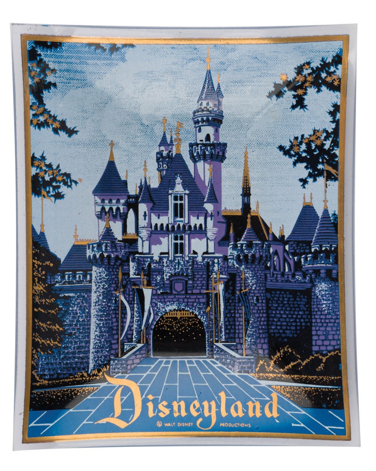 (Disneyland, 1970s) A small souvenir glass tray featuring Sleeping Beauty Castle at Disneyland by Houze Art. The tray comes in its original box. Measuring 4.75"x3.75", the piece is in very good condition with only minor wear.