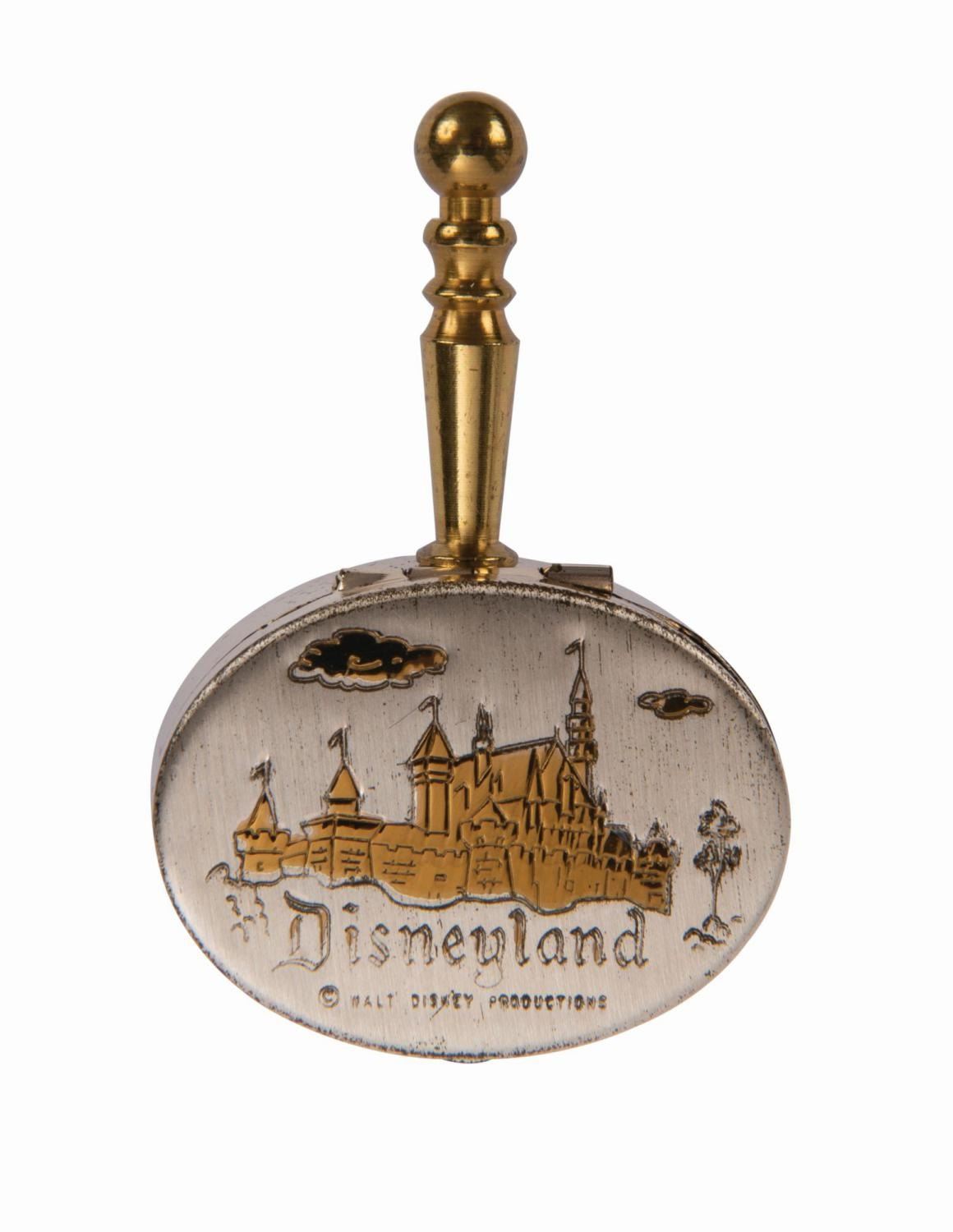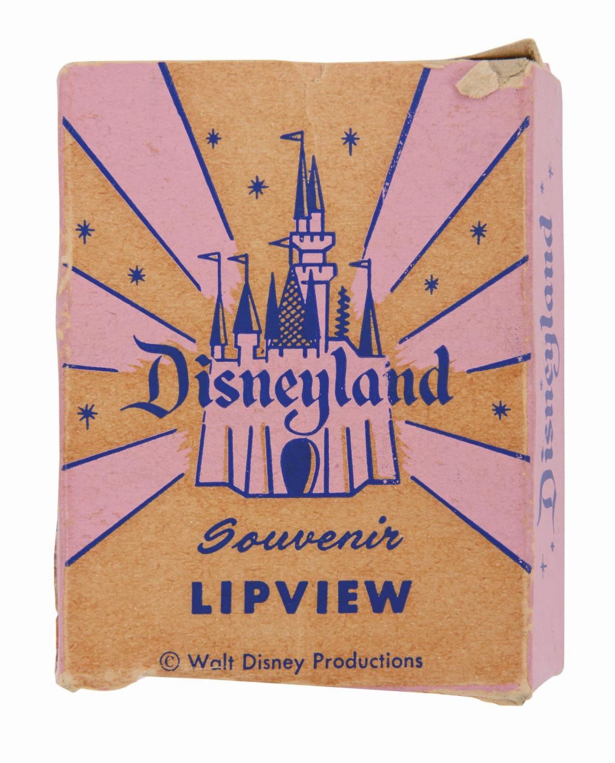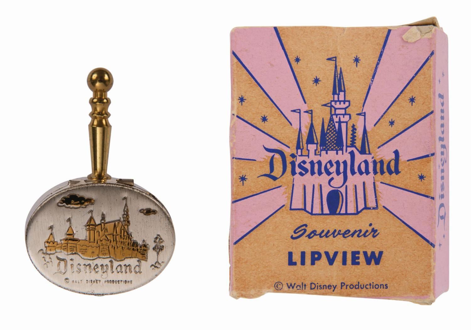 (Disneyland, c.1955) A vintage Disneyland "Lipview" souvenir lipstick holder. The oval, silver-tone "Lipview" compact features a button clasp revealing an etched metal interior, knobbed metallic handle, and a gold-tone image of Sleeping Beauty Castle on the lid. Measuring 2.25"x1.5" and 0.5" deep, the piece is in very good condition sans mirror, with some rubbing, scratches, scuffs, and finish loss. Measuring 3.25"x2.5" and 0.5" deep, the original good-condition souvenir box is included, exhibiting some brown toning, surface loss, and missing flaps.