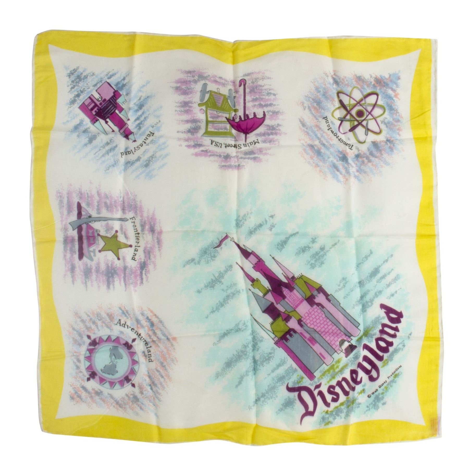 (Disneyland, c.1960) A silk scarf featuring imagery of Sleeping Beauty Castle and representing the park's first 5 lands. The scarf has a yellow border and has a Walt Disney Productions copyright under the word "Disneyland". Measuring approximately 17"x17", the scarf is in good condition with some fold-marks from storage.
