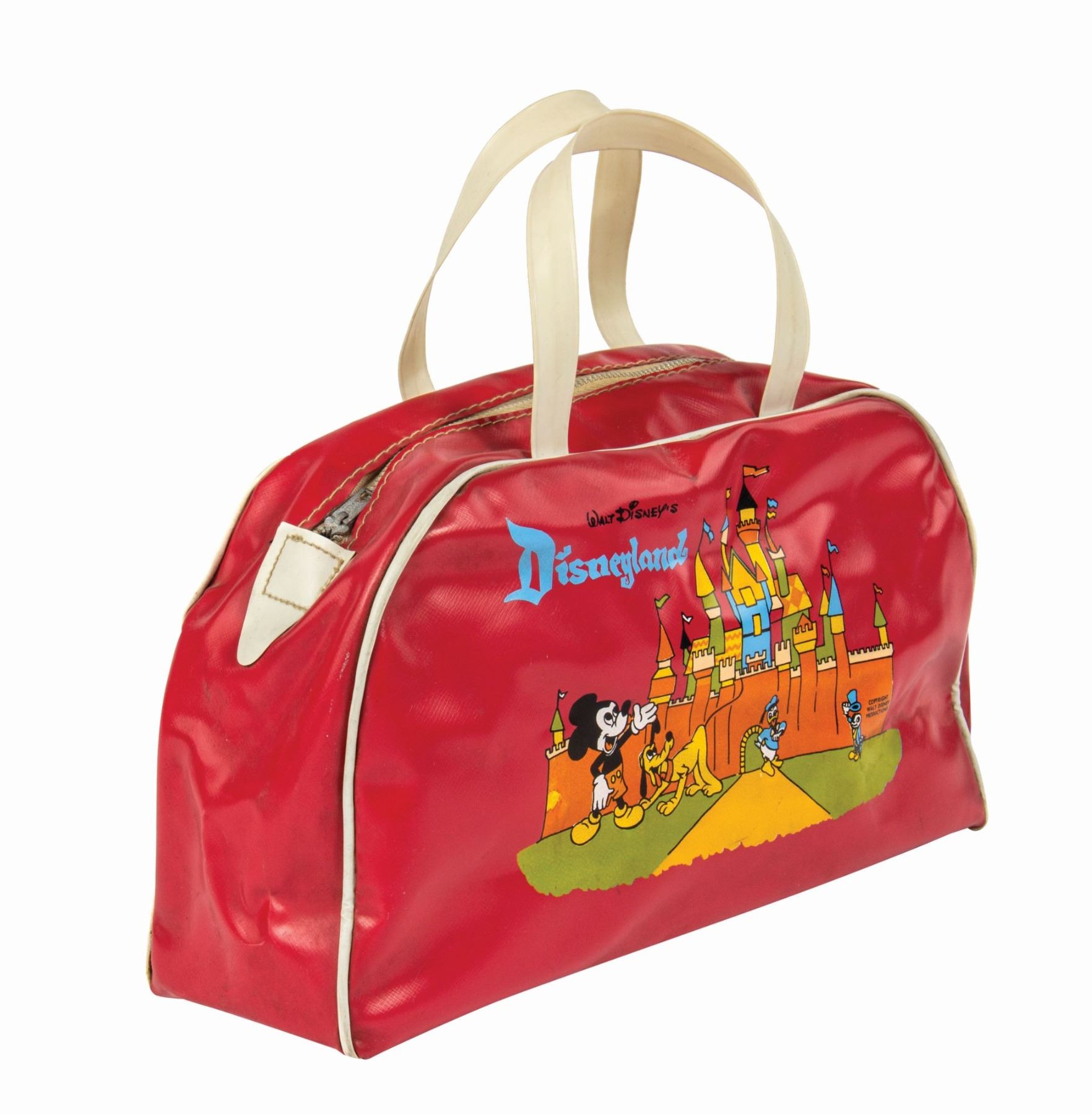 (Disneyland, c.1950s-60s) A small souvenir bag from Disneyland featuring several Disney characters in front of Sleeping Beauty Castle. Measuring 7"x12" and 4.5" deep, the bag is in good condition overall with some surface wear including one small crack by the zipper, and a few spots of discoloration along the base.