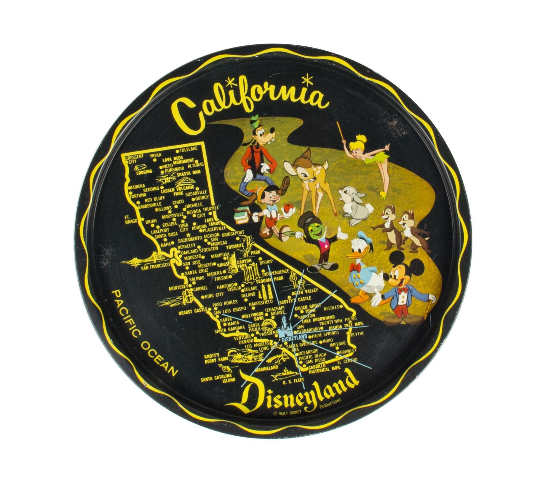 (Disneyland, c.1960) A black souvenir metal tray featuring Disney characters next to a map of California. On the map, California's cities and landmarks are shown with Disneyland highlighted in blue. Measuring 11" in diameter, the tray is in good condition with some surface wear around the rim.