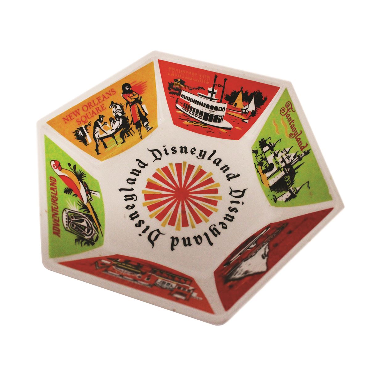 (Disneyland 1960s) Colorful souvenir candy dish featuring stylized graphics of the different lands. Measures 5.25” across and 1.75”. Disneyland stamp on the bottom. In excellent condition.
