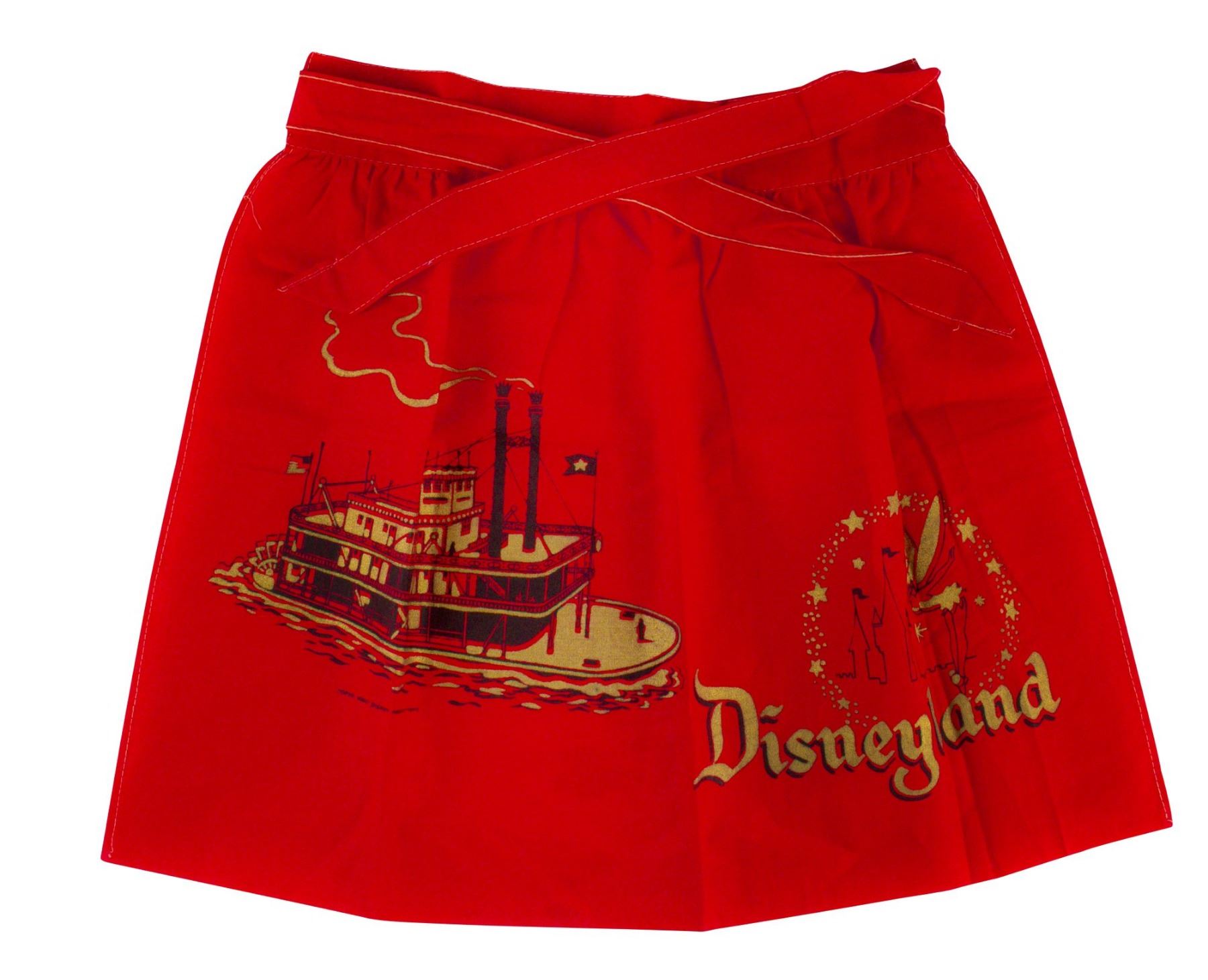(Disneyland, c.1955) A souvenir apron from Disneyland featuring the "Mark Twain". The red fabric is printed with black and gold imagery and lettering. The apron measures 19.5"x25.5" with a 51.5" tie. The condition is very good, with some staining to the apron.