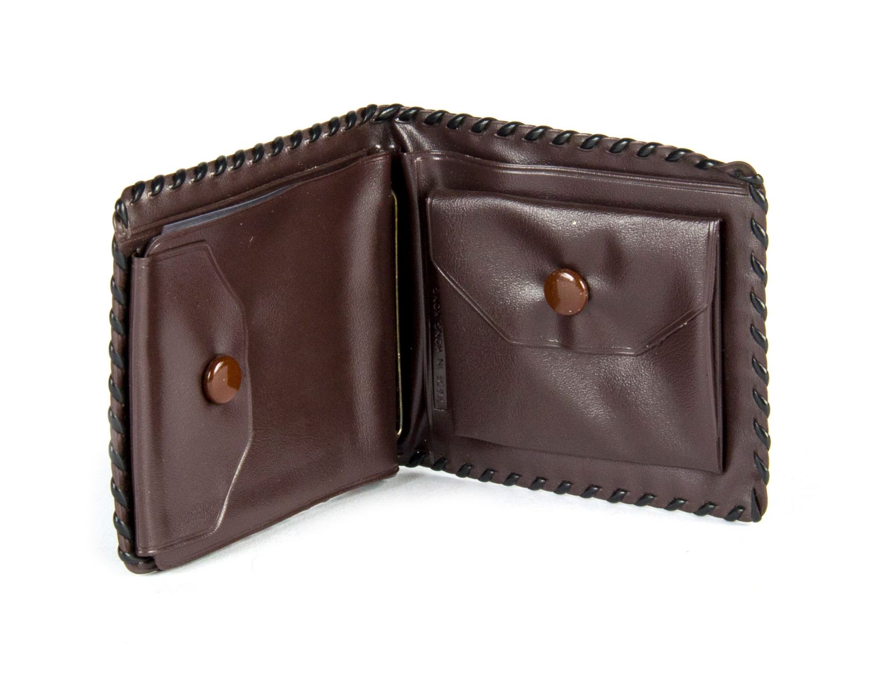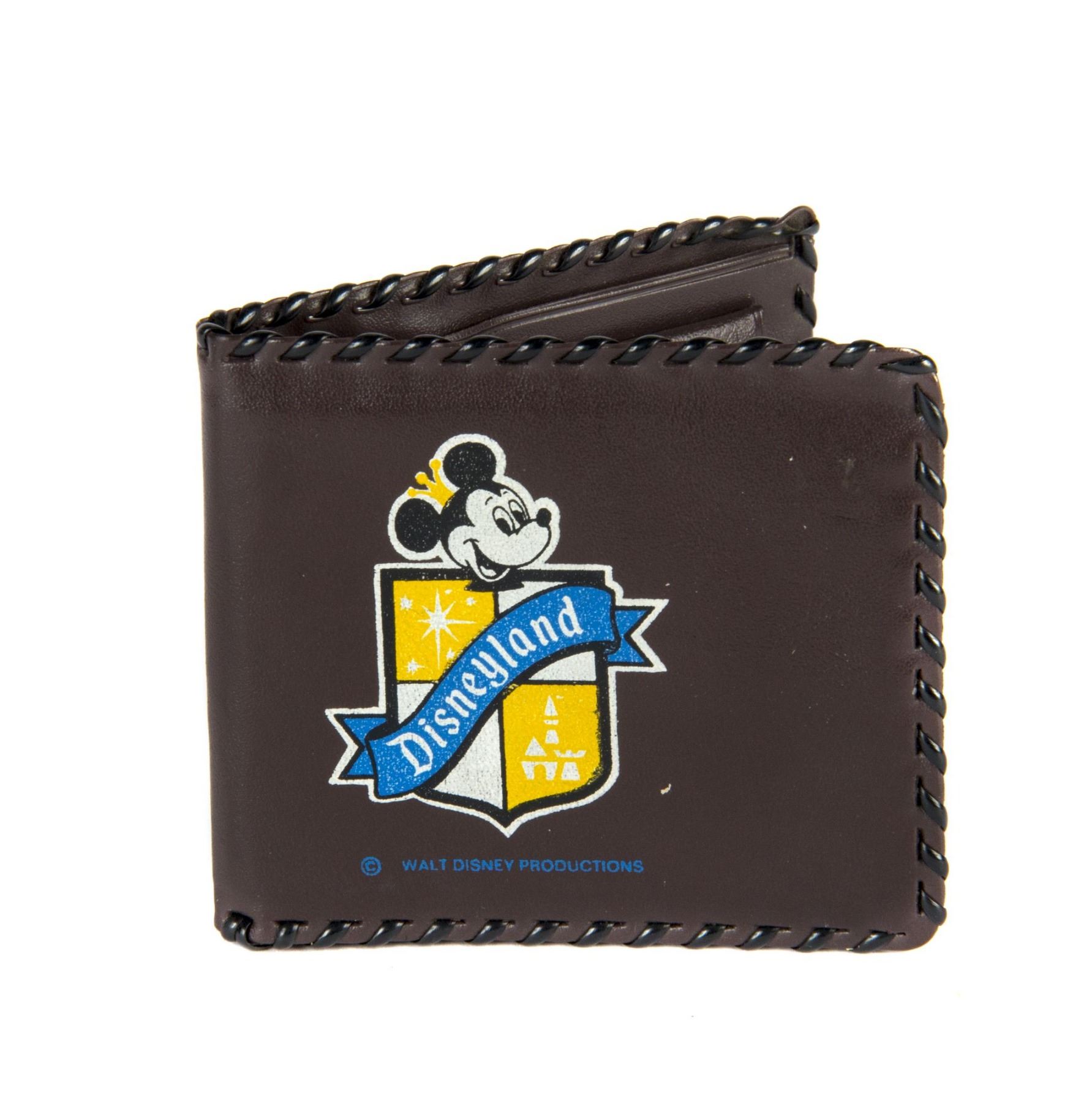 (Disneyland, c.1960s) A child's wallet featuring imagery of Mickey Mouse over a Disneyland crest logo. The wallet has several small compartments and flaps inside and measures 3"x3.5". The condition is very good.