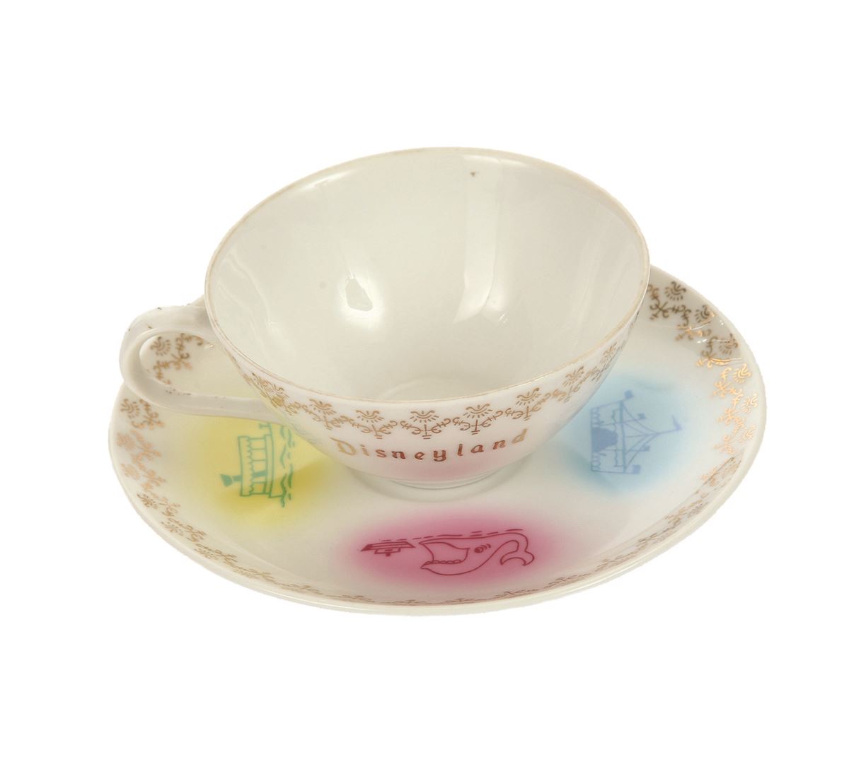 (Disneyland, 1960s-70s) A decorative cup and saucer souvenir set from the park. Features imagery of the different lands on the saucer, with the text “Disneyland” in gold lettering on the cup below an elegant reflective gold pattern. A colorful and appealing set. Cup measures 4” in diameter and 2” high. Saucer measures 6” in diameter. In good condition with minimal wear. Saucer has velcro tabs adhered to base for it’s safety.