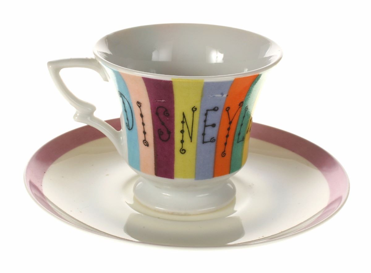 (Disneyland, 1961) Colorful souvenir espresso cup and saucer featuring stylized graphics of the Disneyland logo. Cup measures 2" high and 2.5" in diameter. Saucer measures 4.5" in diameter. Both have Disneyland markings on the bottoms. In fine condition.