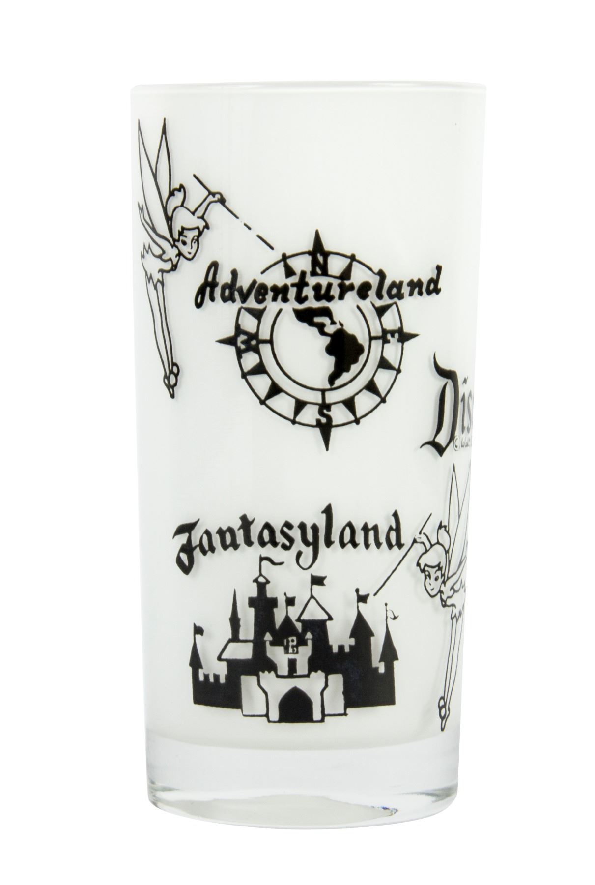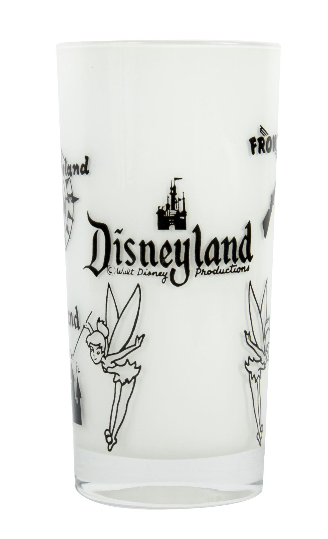 (Disneyland, c.1957) An early souvenir glass featuring Tinker Bell and logos for the various lands of the park. The frosted white glass displays the name Disneyland on the front along with a Walt Disney Productions copyright and measures 5.5" tall. The condition is very good with minor wear.