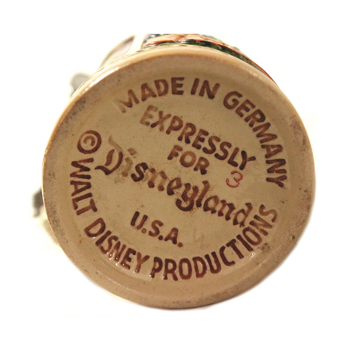 (Disneyland, 1956) Souvenir ceramic German stein sold in the early days of the park. Measures 5.25” high with a 3” base. Disney stamp on bottom. In fine condition.