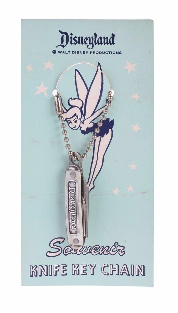 (Disneyland, c.1958) A miniature two-blade pocket knife keychain with "Disneyland" in raised letters on the surface. This item measures 1.75"x0.5" on its original 5"x2.5" display card. This item is in good condition with some wear to the card.