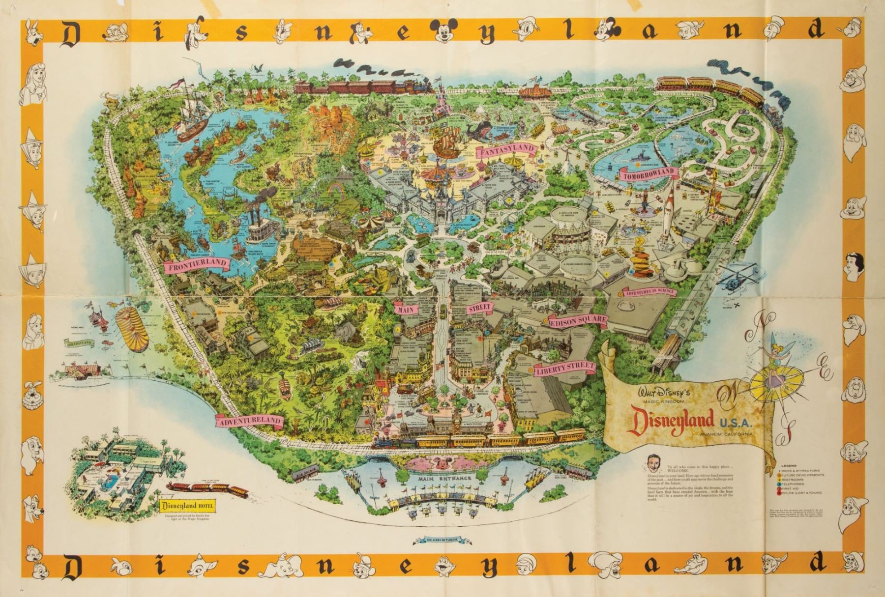 (Disneyland, 1958) A large souvenir map of Disneyland from 1958. This map was the first of three versions of the first-year large format souvenir maps. This 1958-A map features subtle differences from the "B" and "C" versions from this same year, including the only appearance of the "Tomorrowland Viewliner" and "Junior Autopia" attraction, both of which would be removed with the next version of the map. This version is also the only version to depict the water of the "Jungle Cruise" as green where later maps would be blue. The map measures 30"x44.75" and is in good condition with some minor tears on the fold-lines, some tape residue, pin marks in the corners, and some edge-wear.