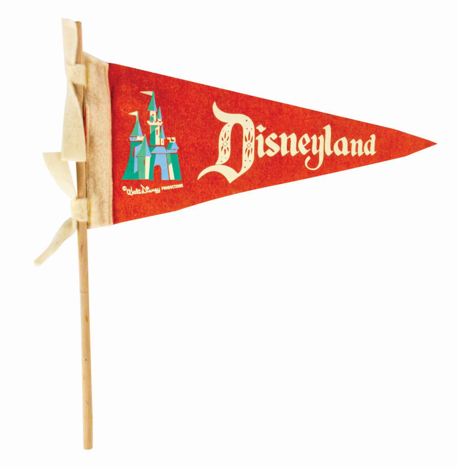 (Disneyland, c.1950s) A vintage souvenir felt pennant from Disneyland that comes displayed on a wooden dowel. The pennant features an image of Sleeping Beauty Castle and text "Disneyland." This particular style of the Disneyland pennant is very rare. Measuring 10.75"x5.75", the pennant is in good condition with minor wear from use.