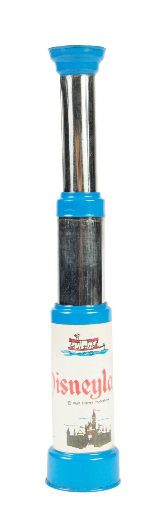 (Disneyland, 1960s) A souvenir spyglass from Disneyland featuring several of the park's attractions around the spyglass body. The spyglass extends with two sections and measures 2.25" in diameter and 12.75" long when fully extended. The condition is good, with a small piece of paper from the interior of the Spyglass loose inside, which occasionally obstructs the view.