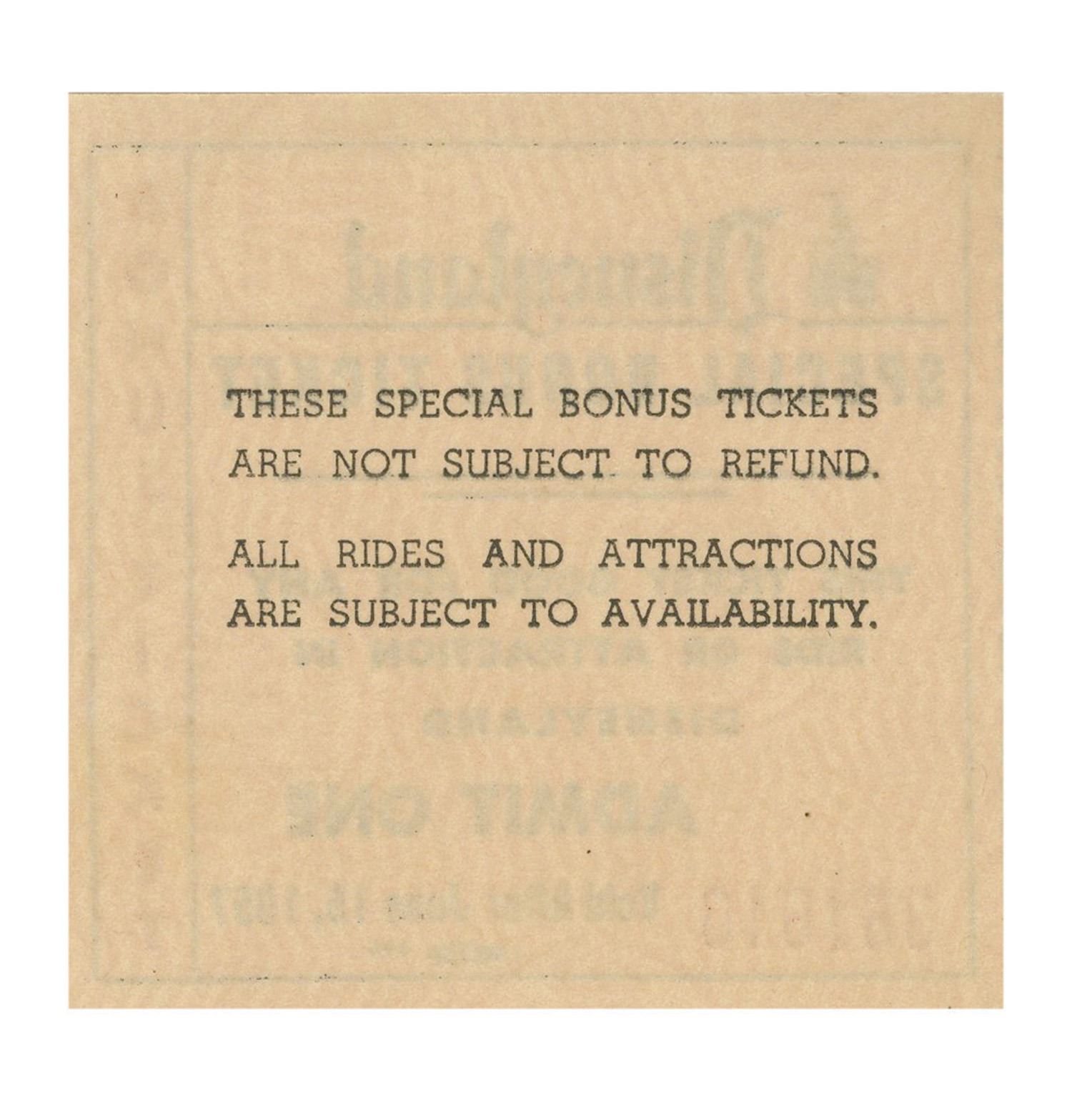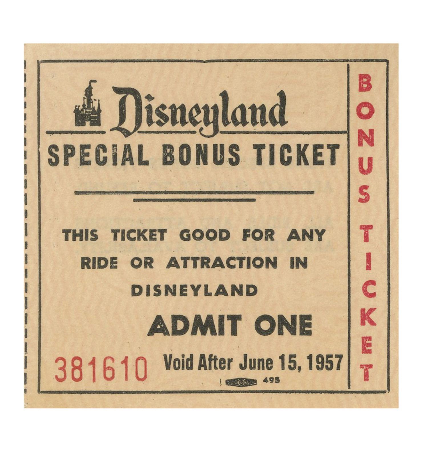 (Disneyland, 1957) A special bonus ticket "good for any ride or attraction in Disneyland." These tickets originally came as a set of two with a perforated edge down the center, and this particular ticket is marked as void after June 15, 1957. The ticket measures 2.5"x2.5" and is in very good condition.