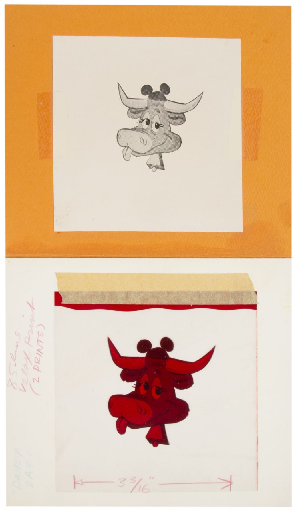 (Disneyland, 1970s) A pair of paintings created to promote special event days at Disneyland. The artwork is for "California Legislators Day at Disneyland" and "Dairy Day at Disneyland" and was likely used on flyers and promotional materials for the events. Both pieces are accomplished in acrylic on artist board with a red cel layer hinged over the artwork. The Dairy Day artwork measures 6.25" x 7.5" while the Legislators Day artwork measures 10" x 15.25". These items are in very good condition with some minor paint wear to the Legislators Day artwork.