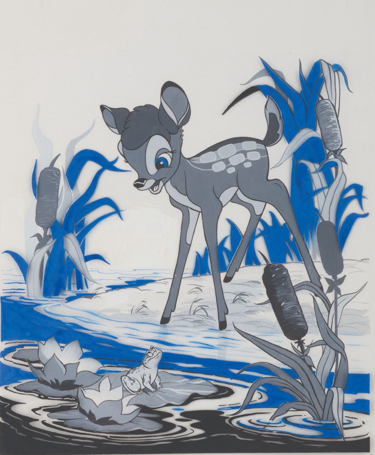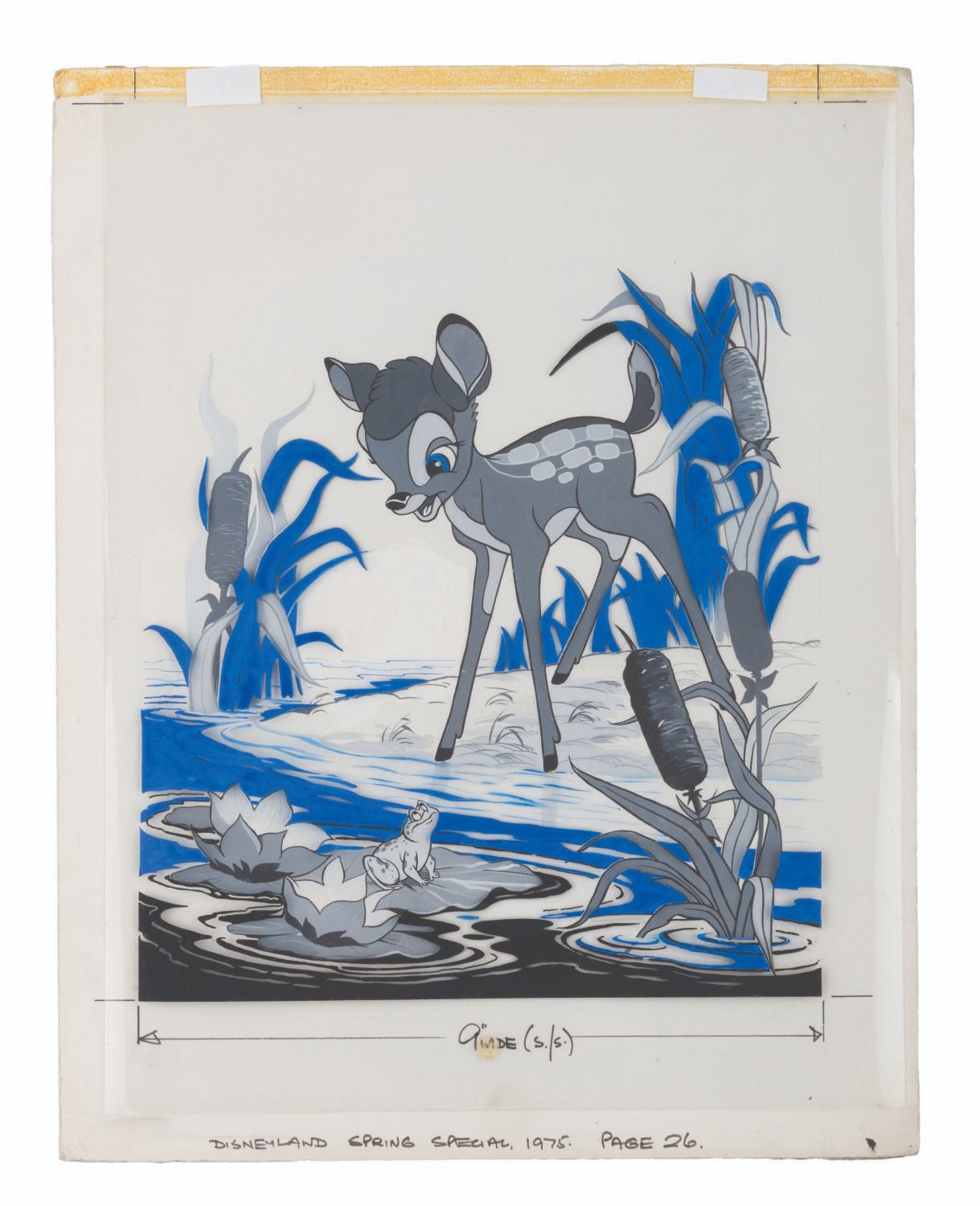 (Disneyland, 1975) An original painting of Bambi and a frog to illustrate the 1975 Disneyland Spring Special. Accomplished in gouache, the image measures 9” x 9.75” on 11” x 14.5” artist board, with blue and some black elements painted on a 10.5” x 13” cel overlay. The piece is in very good condition, with typical wear to the edges from handling and production use.