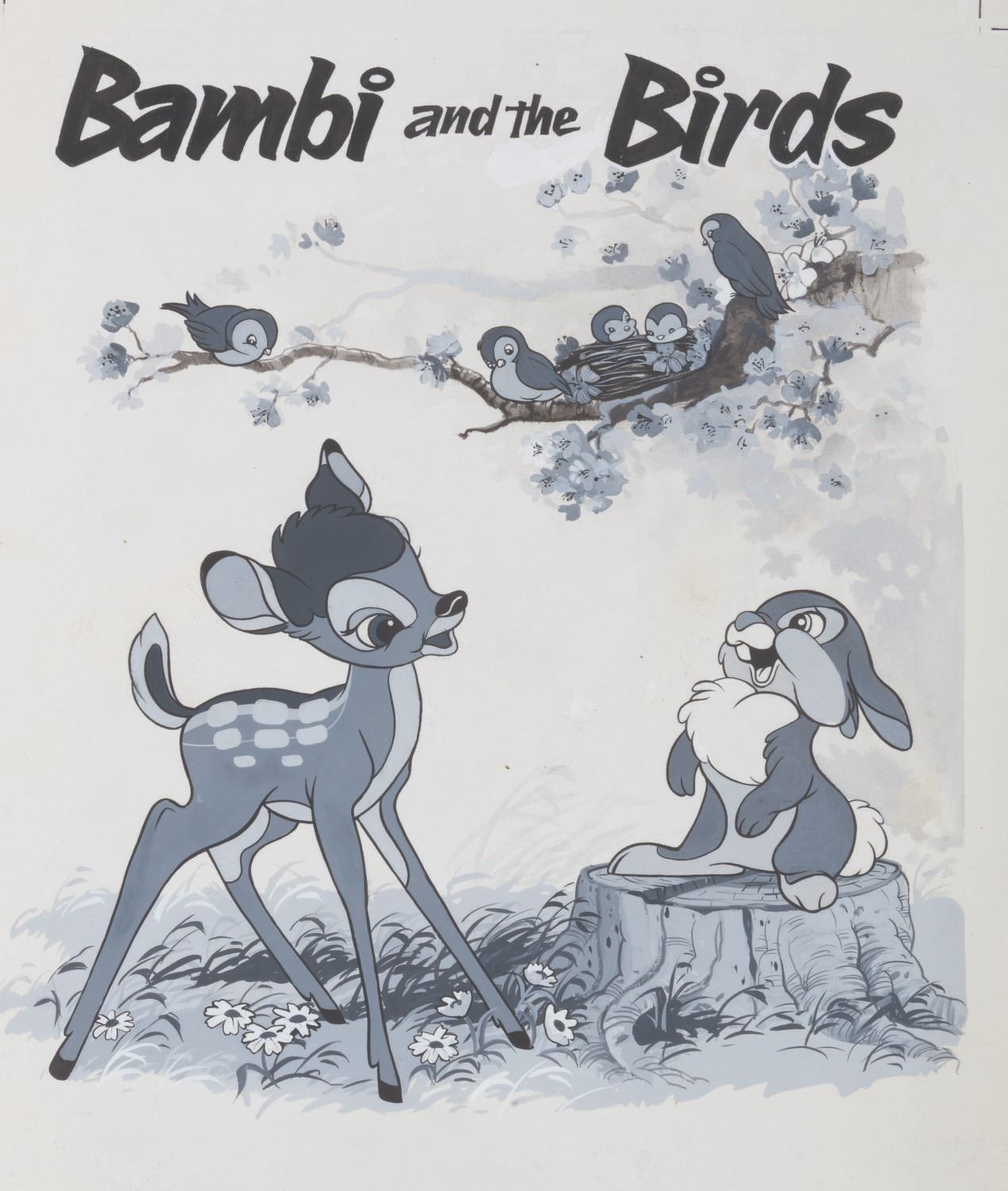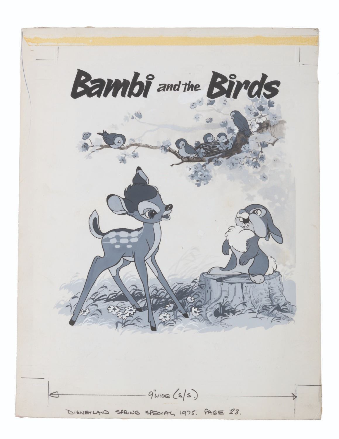 (Disneyland, 1975) An original painting of Bambi and Thumper for the"Bambi and the Birds” story in the 1975 Disneyland Spring Special. Accomplished in gouache, the image measures 8.5” x 9.5” on 11” x 14.5” artist board. The piece is in very good condition, with typical wear to the edges from handling and production use.