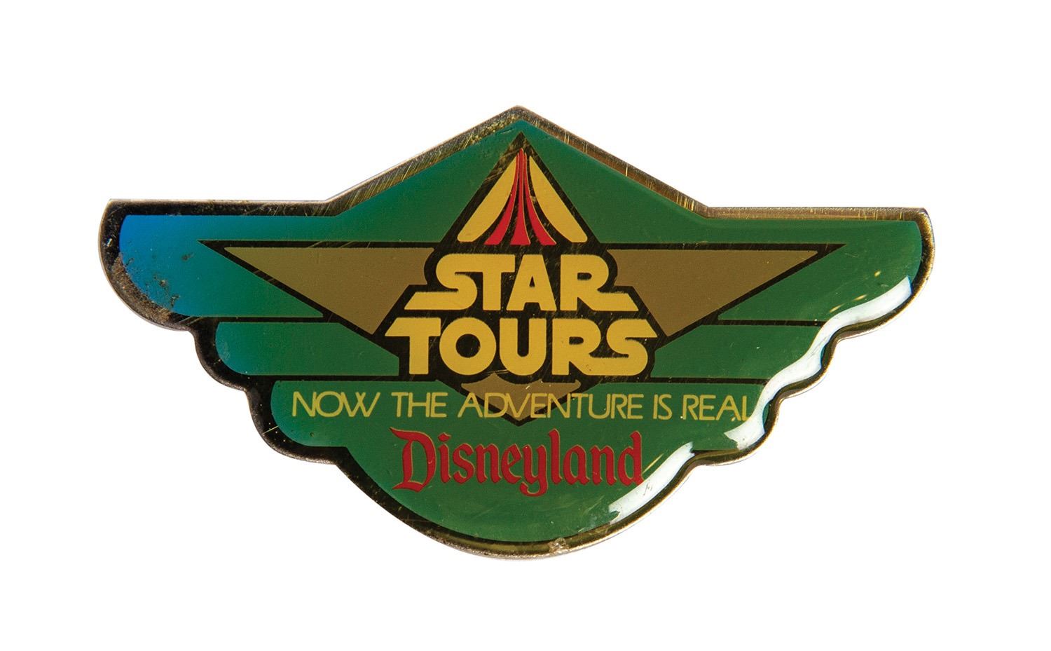 (Disneyland, 1986) A rare Star Tours "pilot wings" media press pin. This pin was given at the press opening for the Star Tours, and has a LucasFilm and Walt Disney Company copyright on the reverse. Measuring 1.25"x2.25", the pin is in good used condition with scuffing and minor color fading.