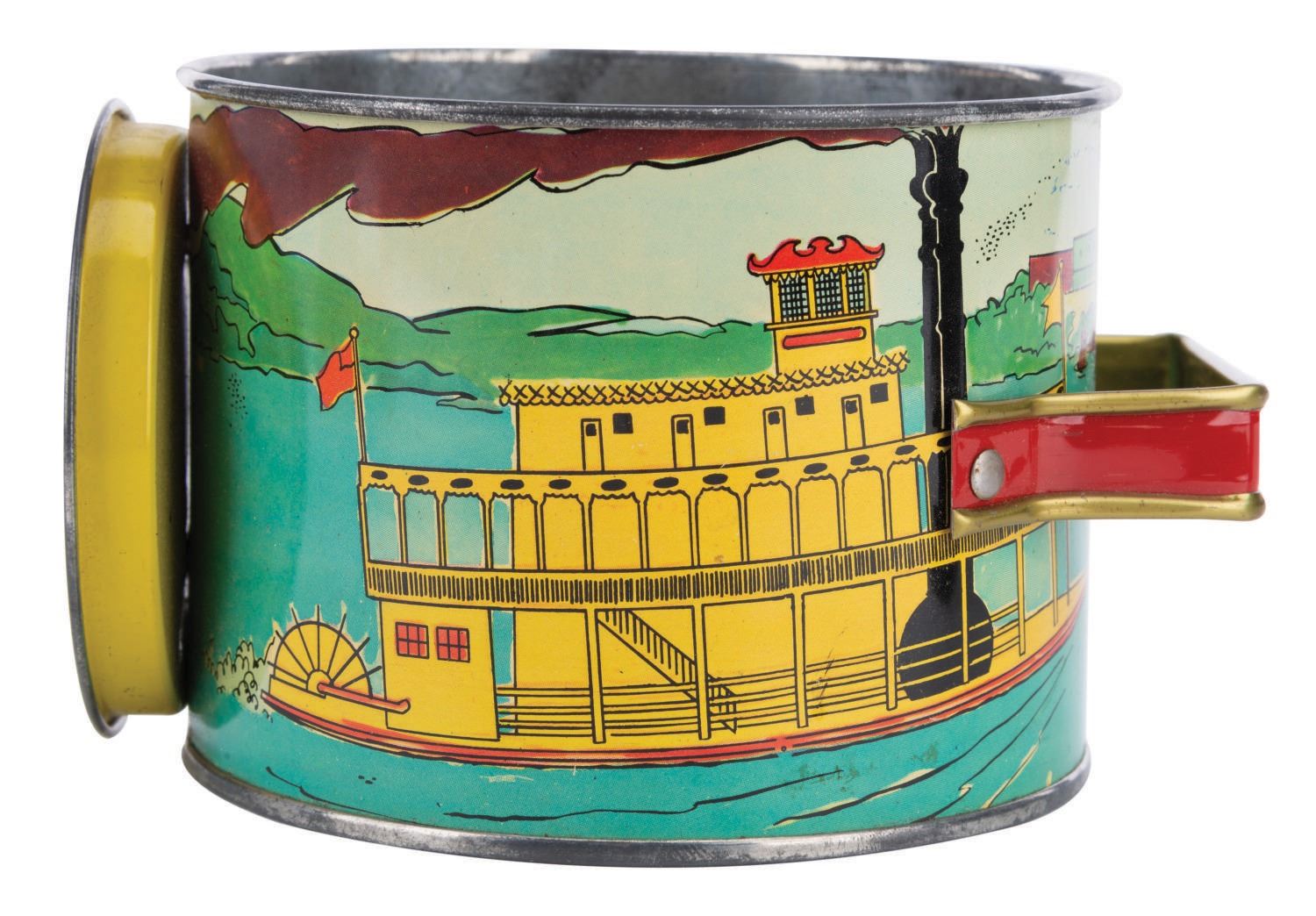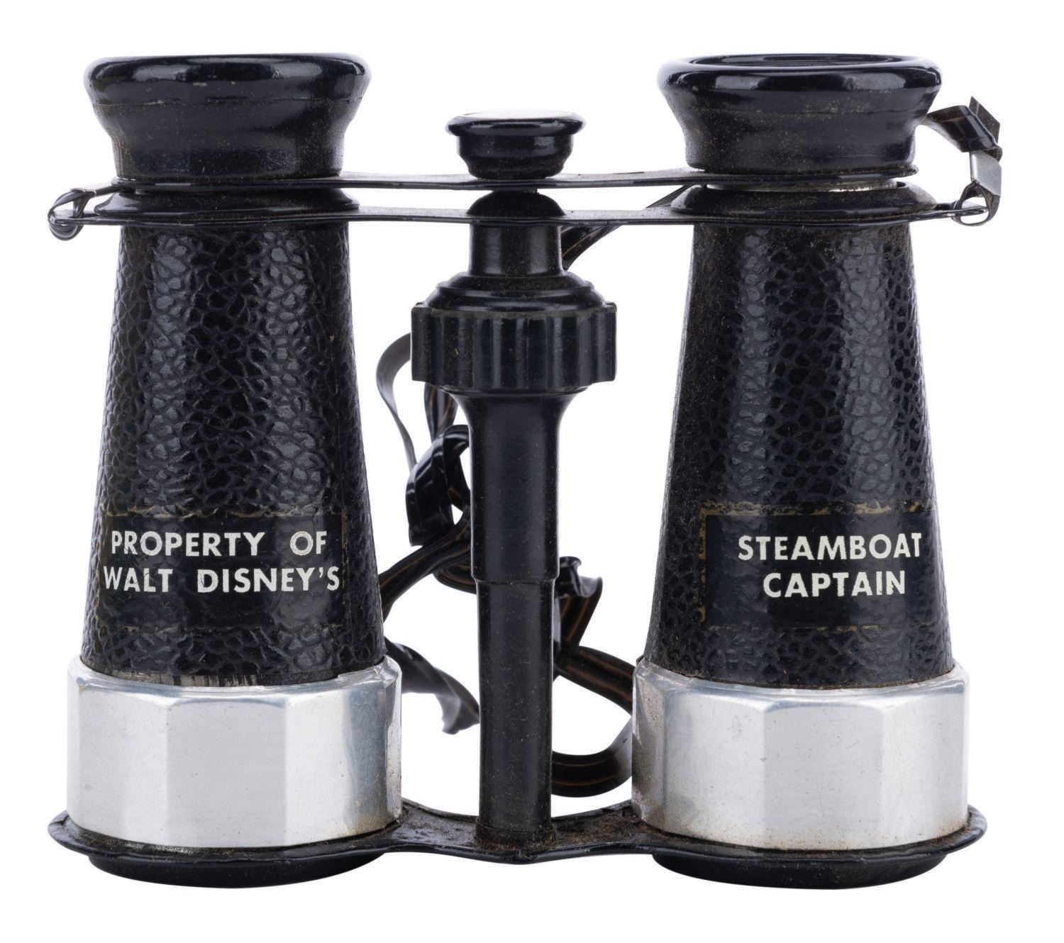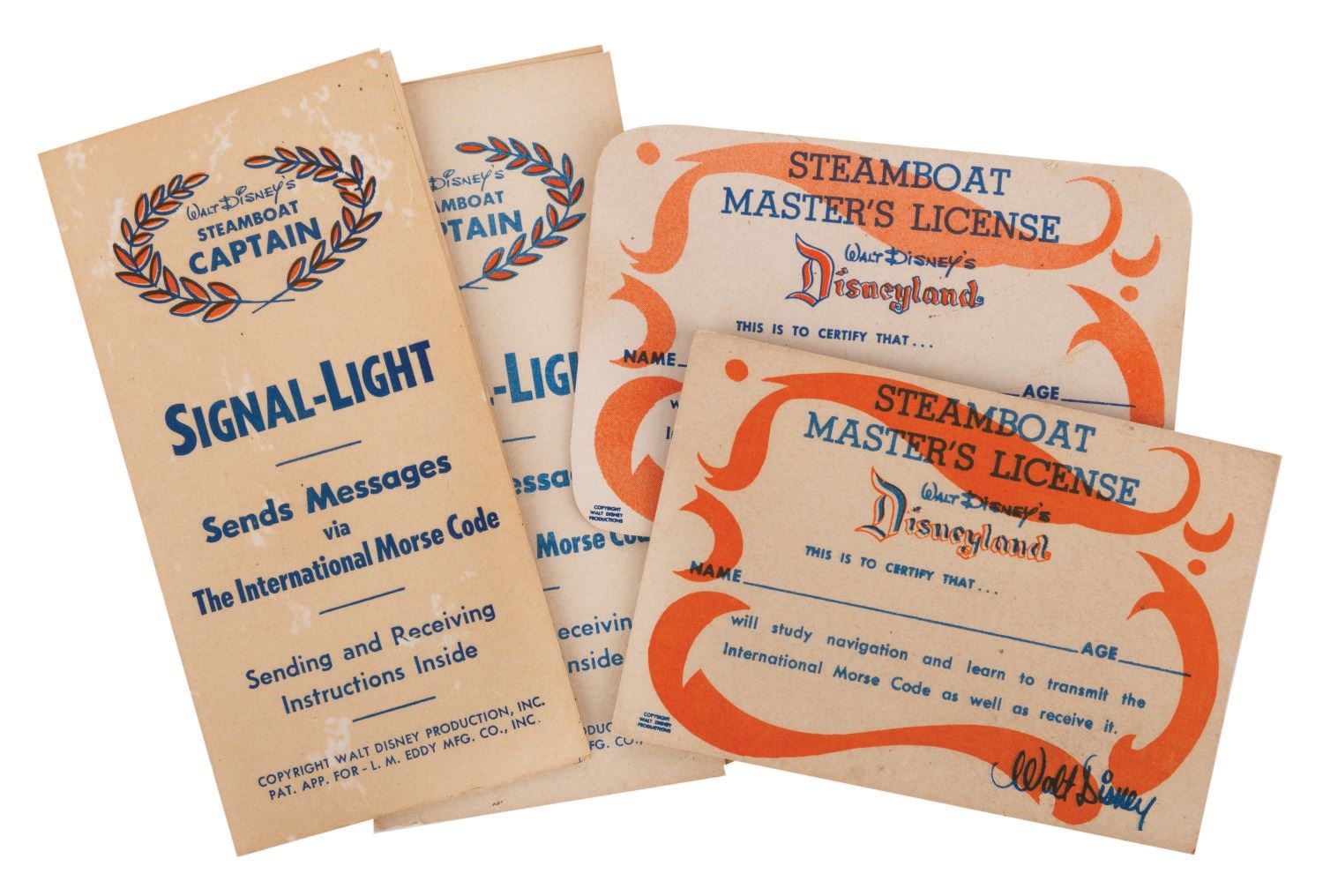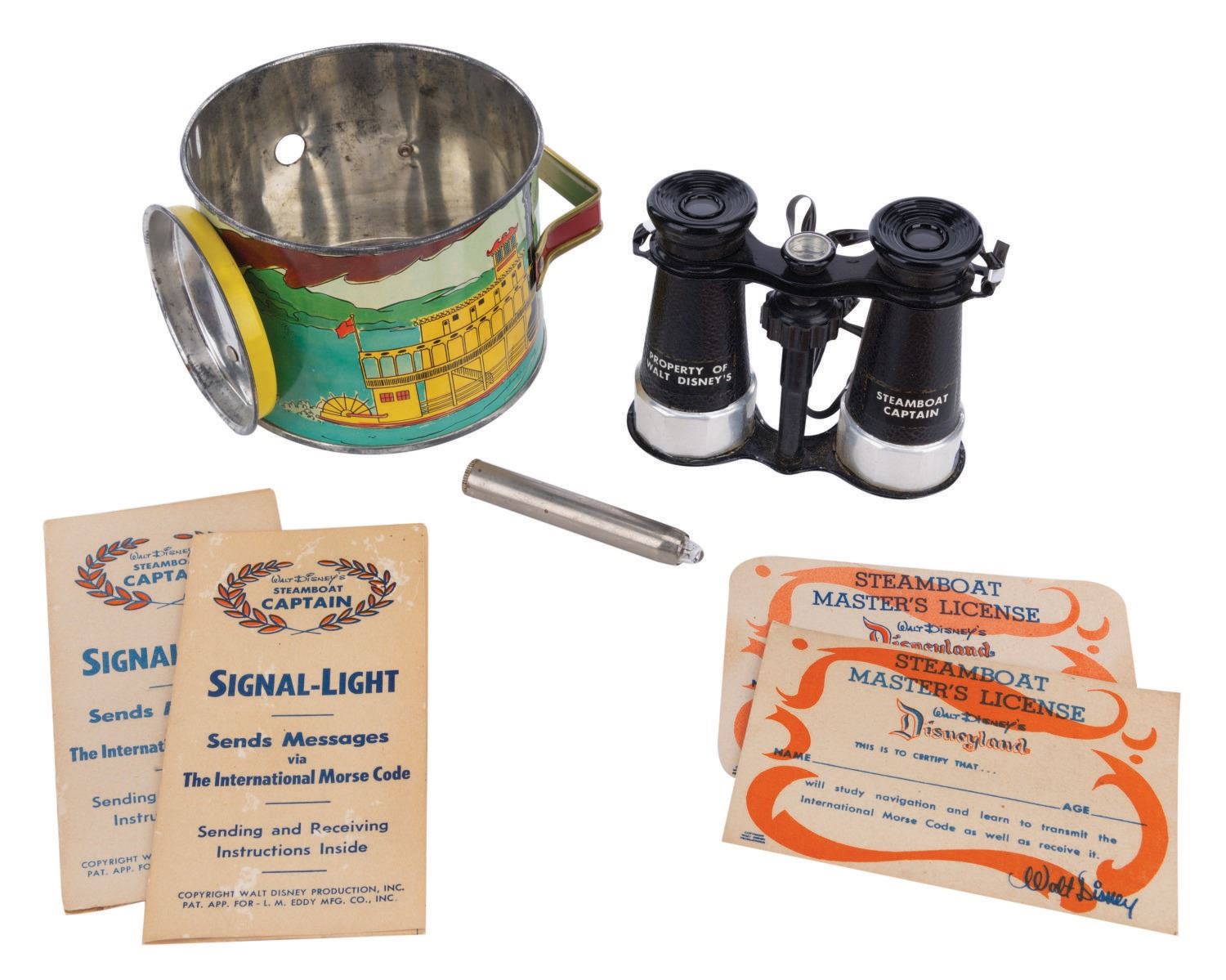 (Disneyland/ L.M. Eddy, 1950's) A very rare Steamboat Captain Outfit by L.M. Eddy, in the original box. The set includes a tin signal lamp with battery operated light, binoculars, (2) morse code booklets, and (2) Steamboat Master's Licenses. The pieces measure various sizes and are in good condition overall, with scuffs and wear from play, and an end piece missing from the light that prevents it from holding a battery to function. Measuring 10"x10"x4" high, the box is in good condition with creases to surface, heavy wear along some edges and corners, and typical wear throughout from age and handling.