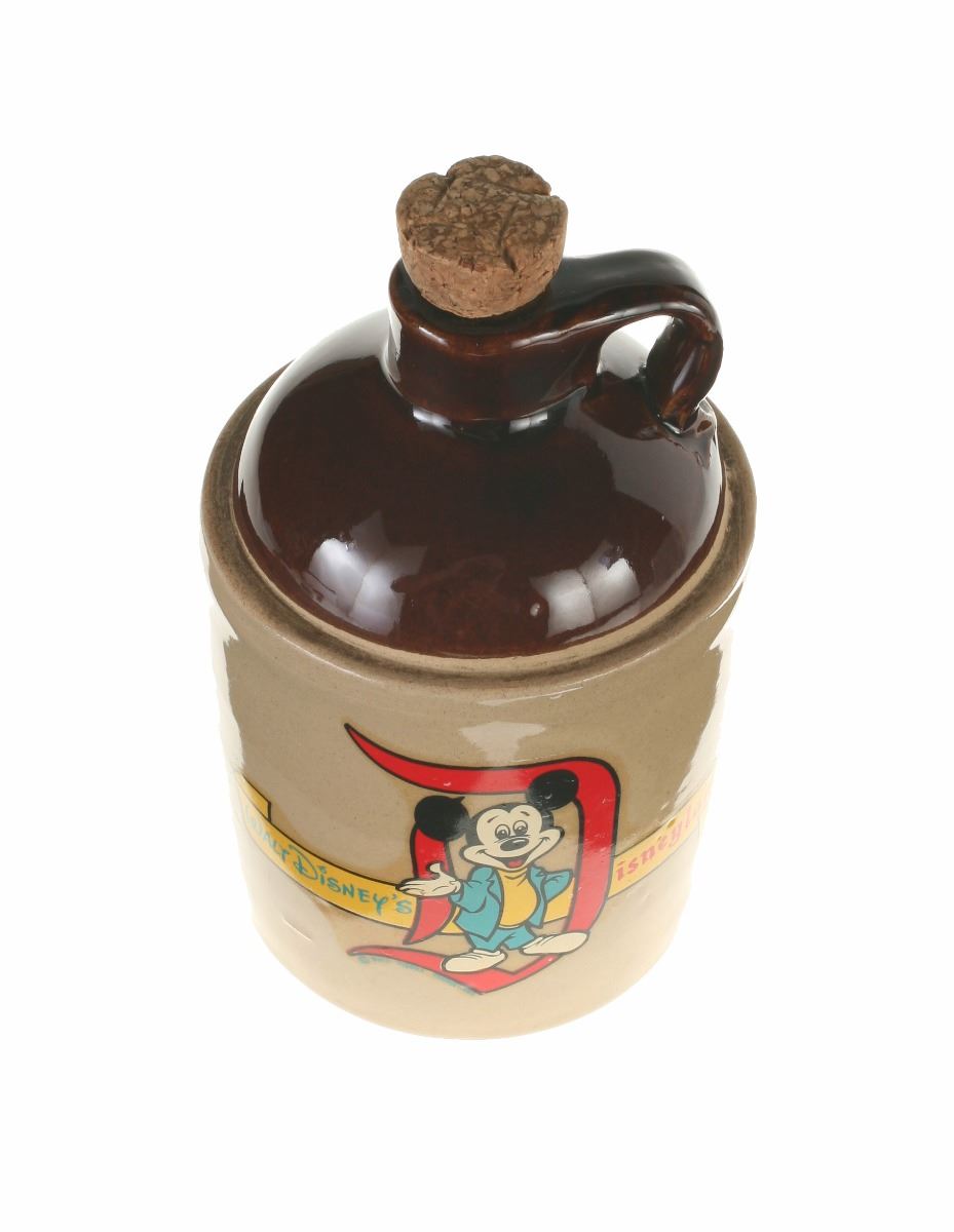 (Disneyland, 1960s) Reads "Walt Disney's Disneyland" on the front with an image of Mickey. Cork stopper on top. Measures 3.75" in diameter and 6.5" tall. In good condition.