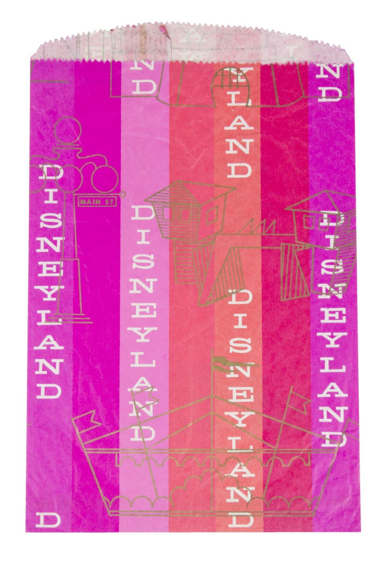 (Disneyland, c.1960s) A colorful shopping bag featuring subtle line art of some of the park's attractions. The bag reads "Disneyland" vertically along the purple, pink, and reddish stripes, and depicts "King Arthur Carousel", the "Mark Twain", the "Disneyland Railroad", and several other attractions and lands. Measuring 11"x7", the bag is in very good condition with some light creasing from use.