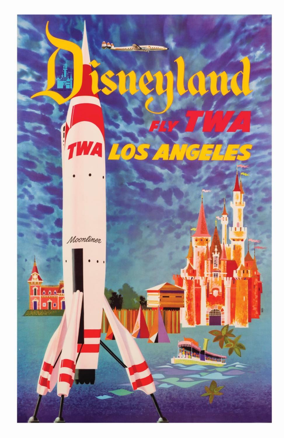 (Disneyland, 1955) A rare and highly sought after Trans World Airlines Disneyland travel poster designed by iconic artist David Klein. A mix of lithography and vibrant dayglo silk-screened detail and lettering, this iconic poster predates the blacklight craze inspired by the 1960s counterculture. The TWA sponsored Moonliner is prominently placed amongst landmarks representing the various park lands, capturing the prevailing spirit of boundless possibility through technological innovation embraced by both Disney and their corporate partner. Rolled and never folded, the poster measures 40"x25" and is in very good condition with only faint corner creasing, edge wear, and handling.