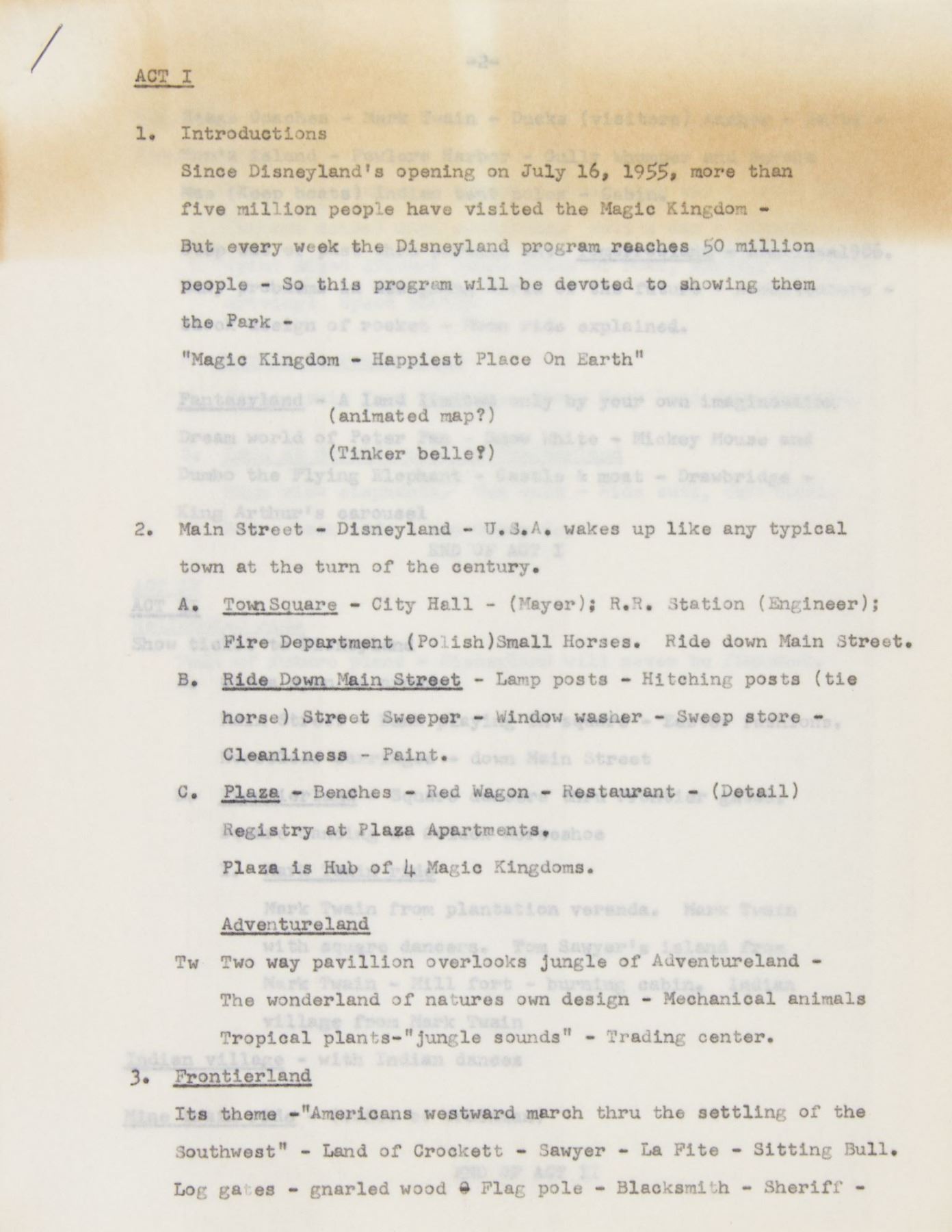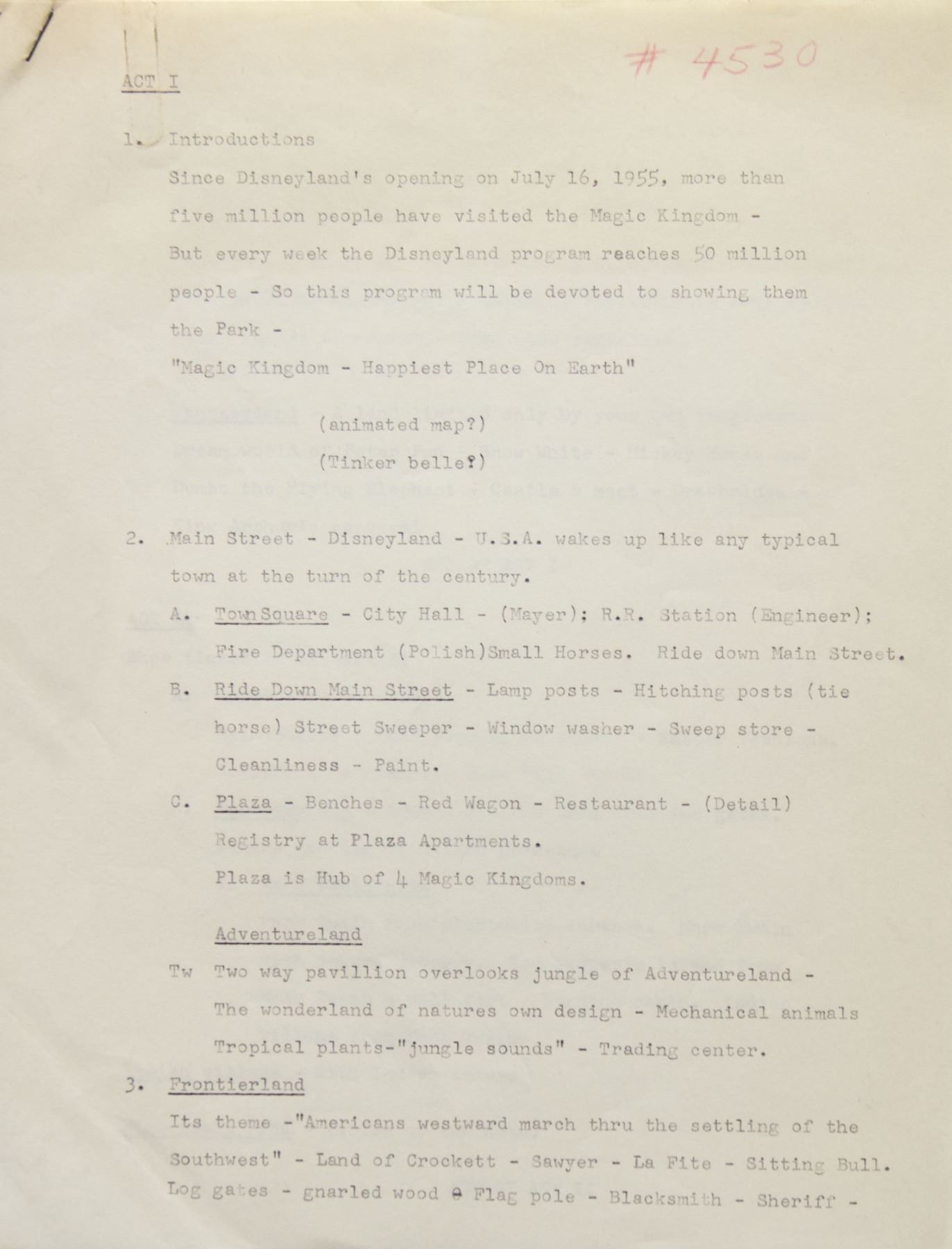 (Disneyland, 1957) An amazing pair of matching typed outlines used during the production of an episode of the Disneyland television show. Both outlines are typed on thin paper, and contain three pages of text for the episode for which they were used. The text includes descriptions of the lands of the park as well as a short segment introduction. These two outlines measure 11"x8.5" and are in good condition with some minor wear. One copy has some discoloration along the top of the first two pages, while the other has "#4530" written on top of first page in ren pencil as well as paperclip marks in the top-left corner of all three pages.