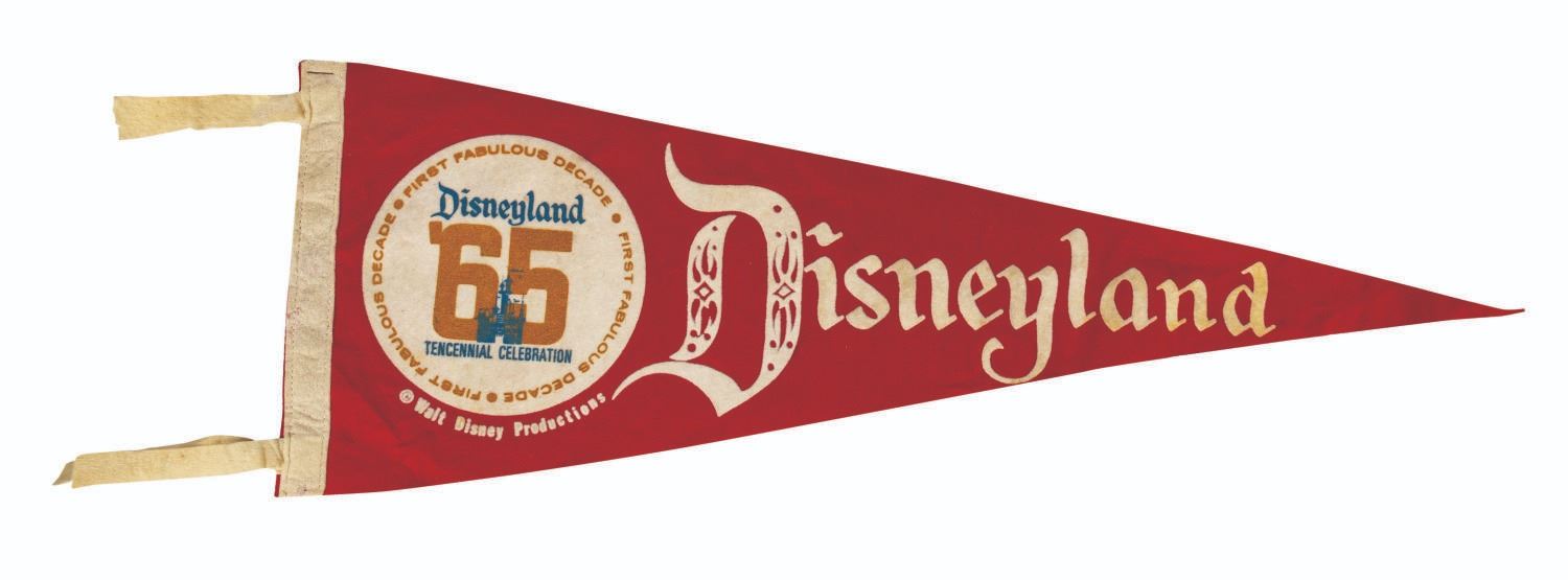 (Disneyland, 1965) A vintage pennant created in commemoration of Disneyland's Tencennial celebration. The red felt pennant features raised flocked Disneyland text logo lettering and a special 1965 tenth anniversary seal graphic. Measuring 8.25"x23.5", the piece is in very good condition with minor color softening and darkening to the white elements from age, as well as a staple in the upper left corner.
