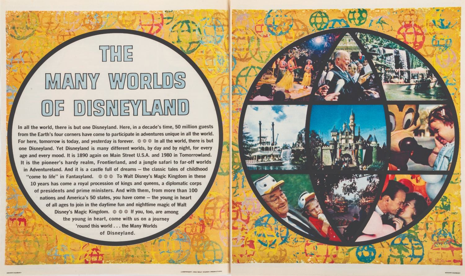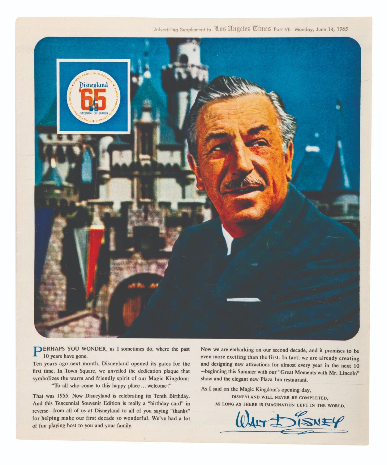 (Disneyland, 1965) A newspaper supplement commemorating Disneyland's 10th anniversary with a history of the Park and full-color photos. This 20-page supplement measures 13" x 10.75" and is in fine condition, exhibiting slight creasing along the spine typical with light handling.