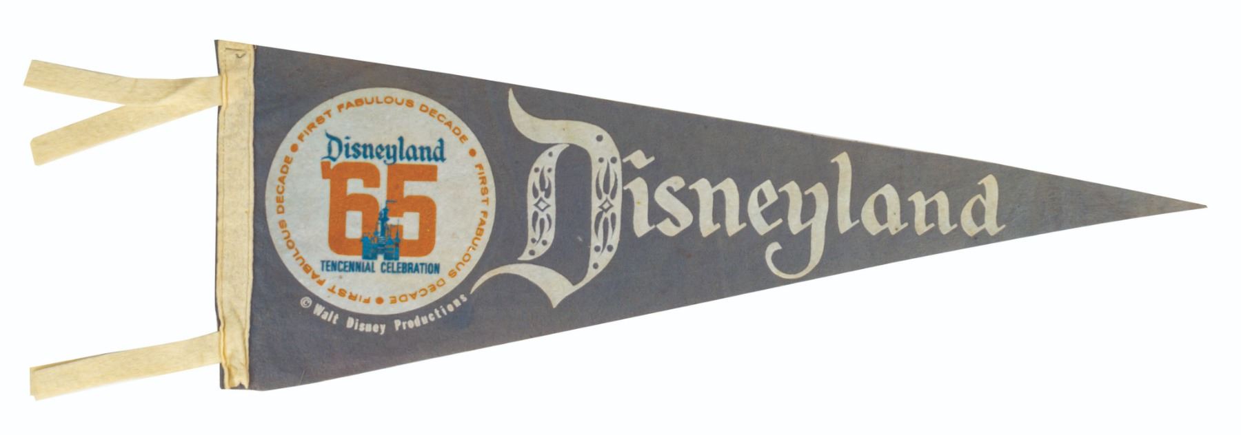 (Disneyland, 1965) A stylish pennant created to celebrate Disneyland's 10th anniversary. The pennant measures 8.5"x24" and is in good condition with minor creasing and some color-wear throughout.
