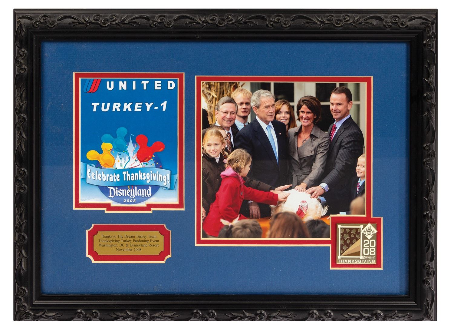 (Disneyland, 2008) A very rare crew gift for the event team working on the Thanksgiving Turkey Pardoning event in November of 2008. In 2008, the Thanksgiving turkey chosen to be pardoned by President Bush traveled to Disneyland following its pardoning event. This framed set was given to a member of the event team and features a photo of President Bush with the pardoned turkey, as well as a custom pin from the Disneyland Thanksgiving event, and a plaque describing the celebration and efforts of the crew. Measuring 13"x18" within its frame, the crew gift is in very good condition.