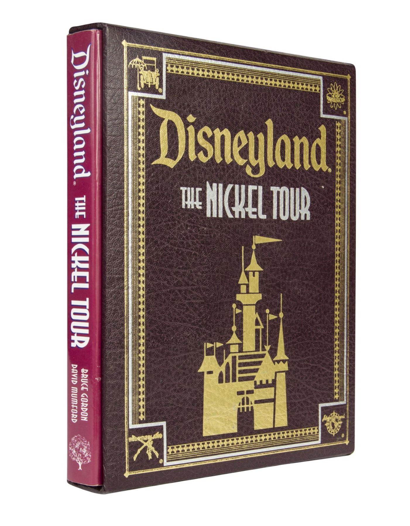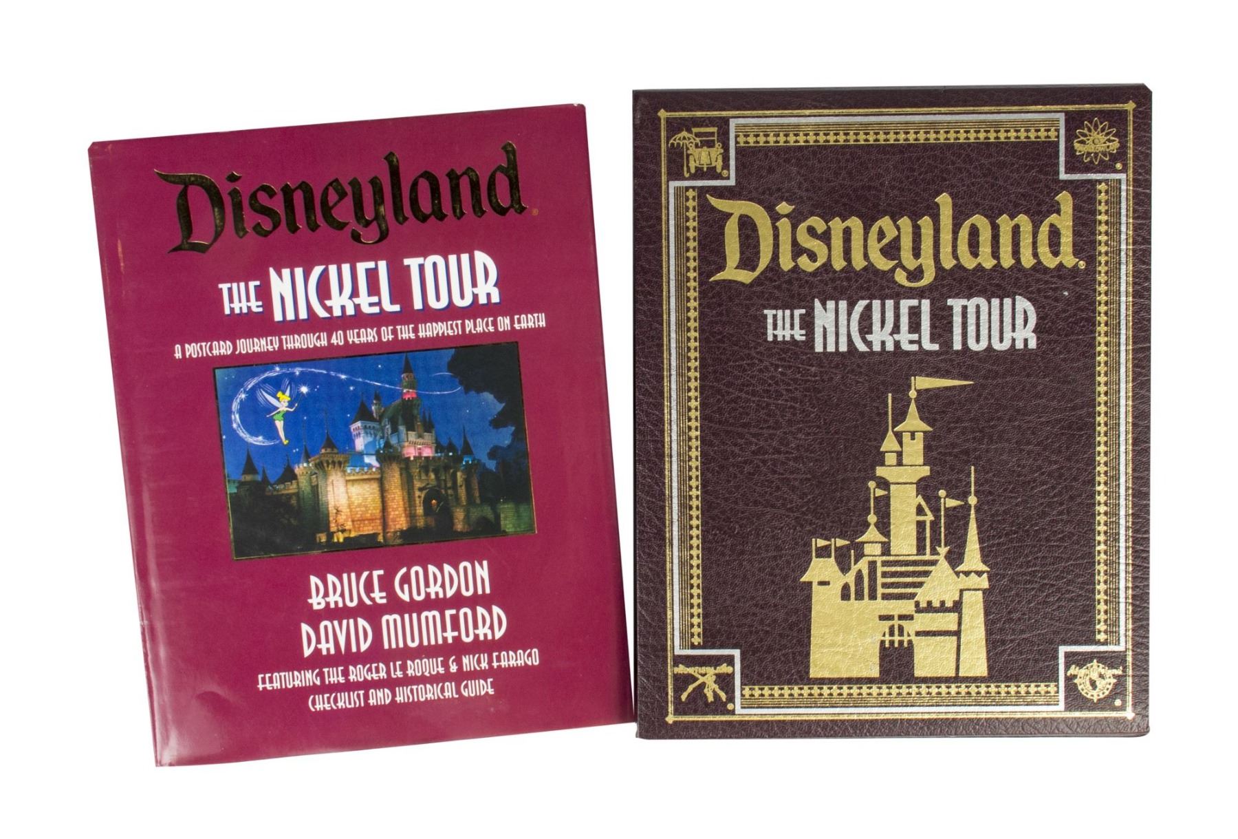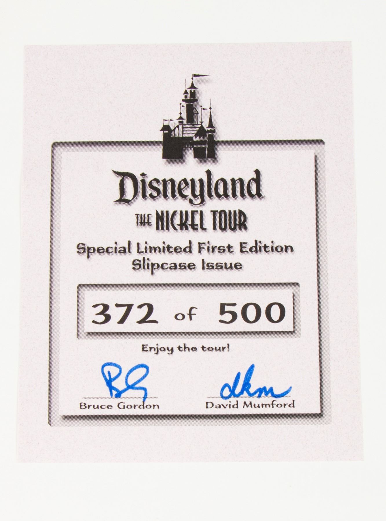 (Disneyland, 1995) A very rare special limited edition slipcase issue of "The Nickel Tour" by Bruce Gordon and David Mumford. The book is numbered 372 of only 500, and is signed by both Gordon and Mumford on the edition page and the title page. The book comes in a beautiful plush slipcase with Sleeping Beauty Castle imagery and logos for the park's original lands. "The Nickel Tour" is considered a must-have for Disneyland collectors, and is often regarded as the definitive book on Disney postcard collecting. Measuring 11.75"x9.25" and 2" thick within the slipcase, the book is in very good condition with some wear to the dustjacket from use.