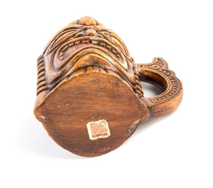 (Disneyland, 1960s) An original mug from Disneyland featuring beautiful Tiki inspired imagery. The mug, created by Treasure Craft of Hawaii, still retains its original Disneyland sales sticker on the base. This mug measures 5.5"x3.5" and 5" tall, and is in very good condition with minor wear.