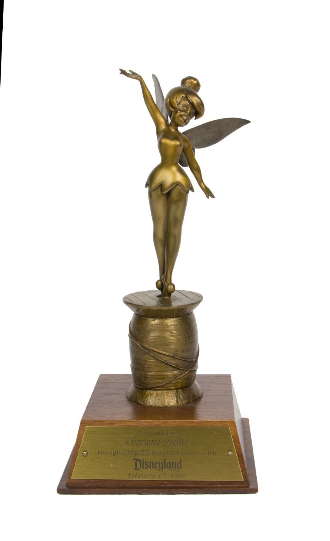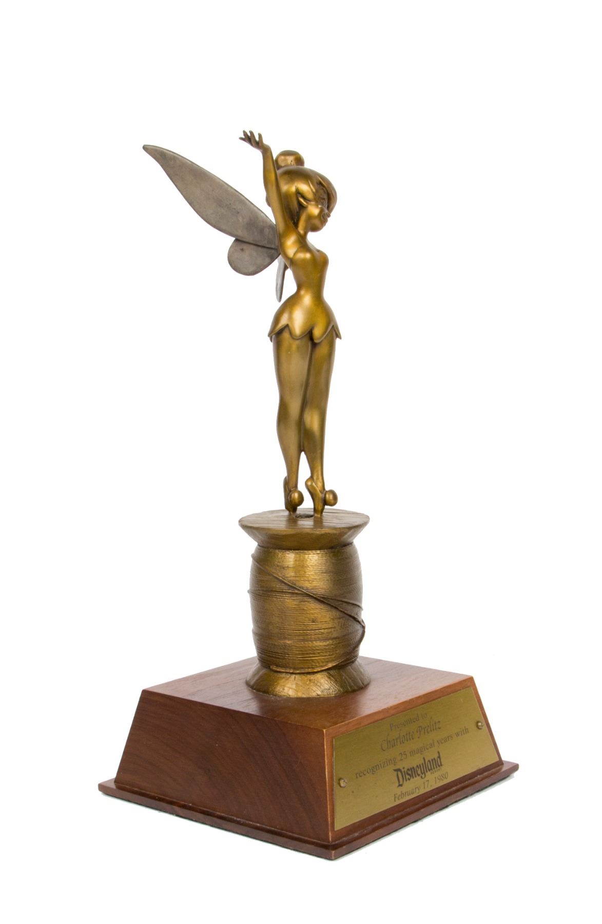 (Disneyland, 2005) A beautiful cast member award given in celebration of "25 magical years with Disneyland". The bronze award features Tinker Bell atop of spool of thread, and the wooden base has a plaque which notes the anniversary. Measuring 12" tall, the award is in very good condition with a very small nick in Tink's cheek.